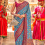 This saree is crafted from luxurious Patola silk, featuring an exquisite play of colors and patterns that highlight its rich heritage. The base comes in a striking blue with traditional Patola motifs in yellow, white, and orange, forming a vibrant and symmetrical design across the drape. Intricate zari weaving with floral detailing along the border and pallu brings a touch of opulence, making it a perfect attire for grand celebrations and traditional events.