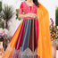 The set is completed with a bright yellow dupatta, made from faux georgette and embellished with beautiful embroidery. This colorful and stylish lehenga choli set is ideal for weddings, sangeet nights, and celebrations.