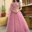 Make a stunning entrance in this enchanting pink net lehenga, beautifully adorned with intricate sequin and thread embroidery, perfect for any special occasion.