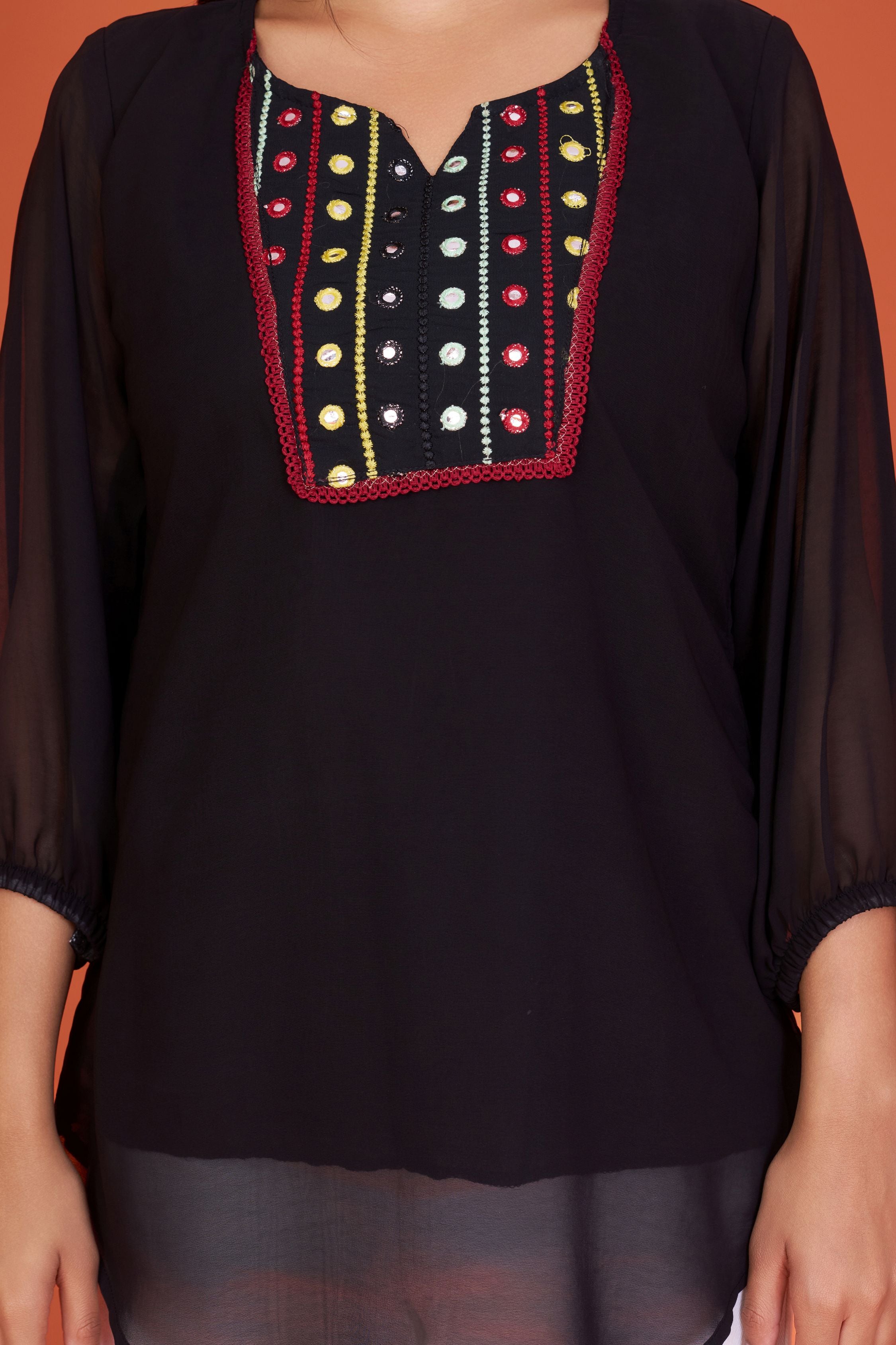 This outfit features a chic black georgette kurti designed with sheer full sleeves and a stylish high-low hemline. The neckline is accentuated with colorful mirror work embroidery in yellow, red, green, and white, bordered with red piping for a striking contrast. Paired with white bottoms, the look blends elegance with modern ethnic charm, perfect for casual and semi-formal wear.