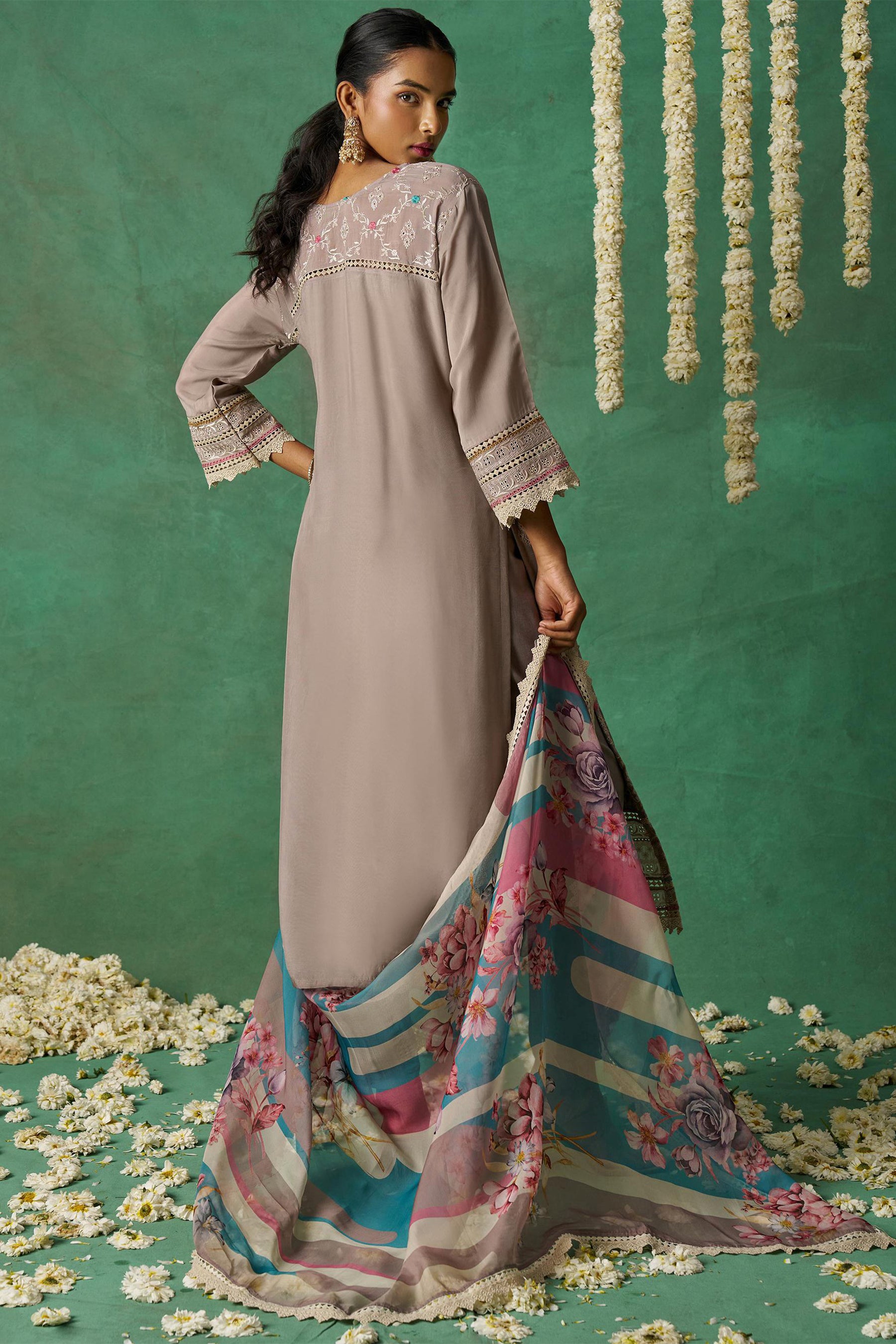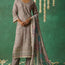 The matching straight-cut pants maintain a clean, minimal aesthetic in the same taupe-grey shade, balancing the richly embroidered kurta. The dupatta adds a dreamy contrast with its soft pastel floral print and broad striped pattern in hues of teal, rose, and beige.