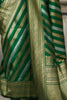To complete this timeless ensemble, the saree comes with a matching unstitched green blouse crafted from fancy fabric, incorporating beautiful zari weaving details that enhance its allure. This exquisite combination not only embodies refined traditional aesthetics but also ensures graceful draping, allowing you to radiate elegance and charm at any occasion.
