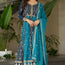 Crafted from flowing georgette fabric, the blue gown features rich embroidery in gold threads with intricate motifs all over. The bodice is beautifully adorned with embellishments, and the sleeves have delicate embroidered detailing.