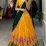 This ensemble is a vibrant expression of Indian ethnic wear, featuring a mustard yellow lehenga adorned with intricate thread embroidery and zari work. The lehenga is stitched to a generous 42 inches with a beautiful 3.50-meter flair, perfect for creating a graceful silhouette.