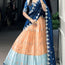 Paired with the lehenga is a teal blue unstitched banglory blouse, detailed with elegant prints and zari weaving work. Measuring 1 meter, it allows for a customized fit, adding a bold contrast and refined finish to the overall ensemble.
