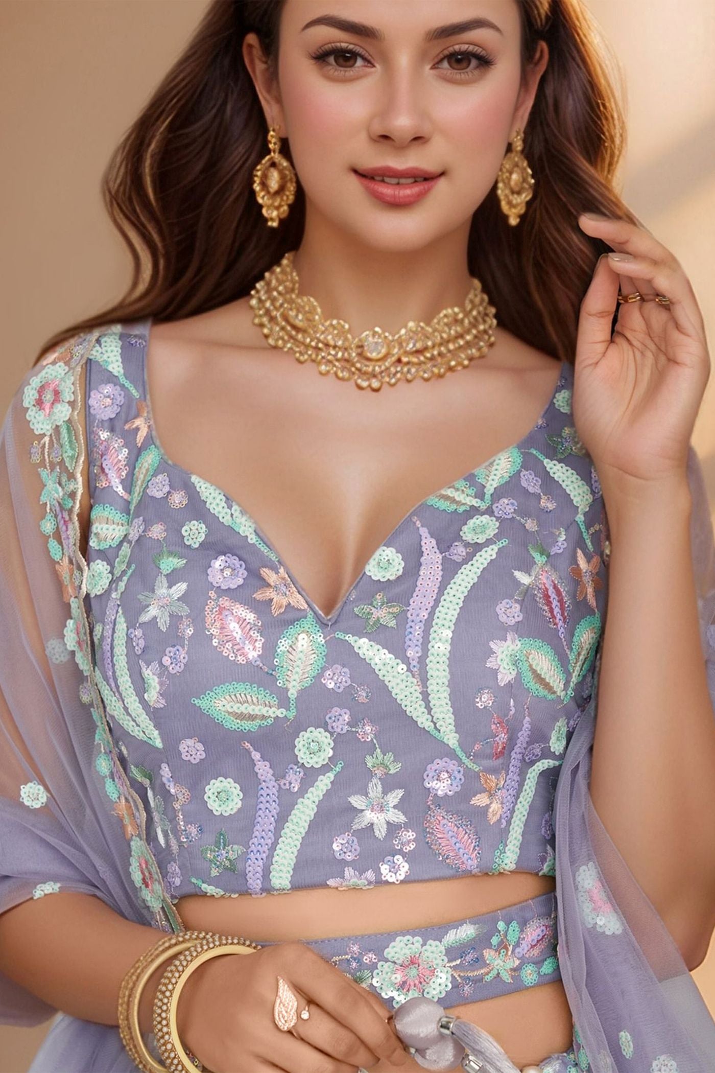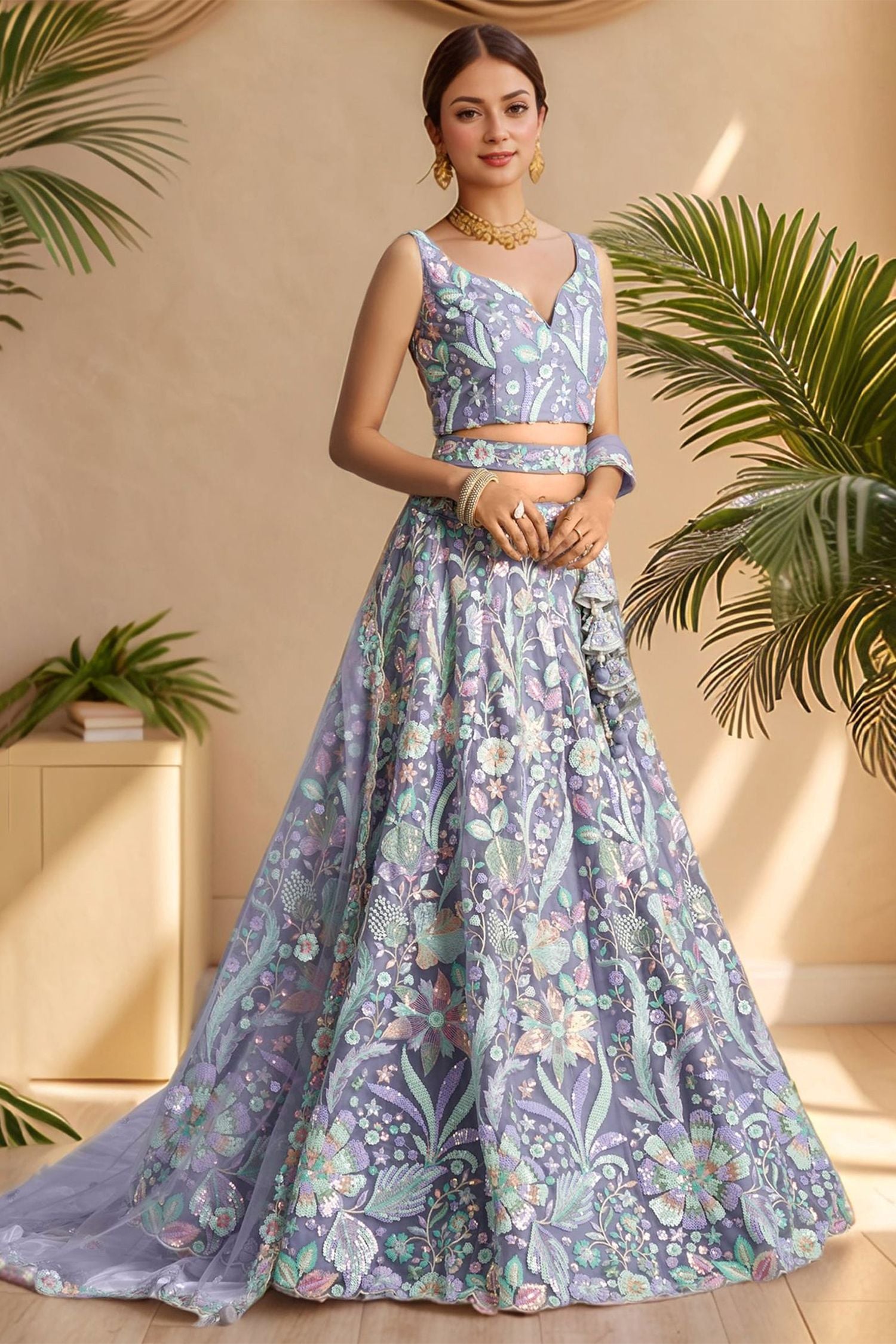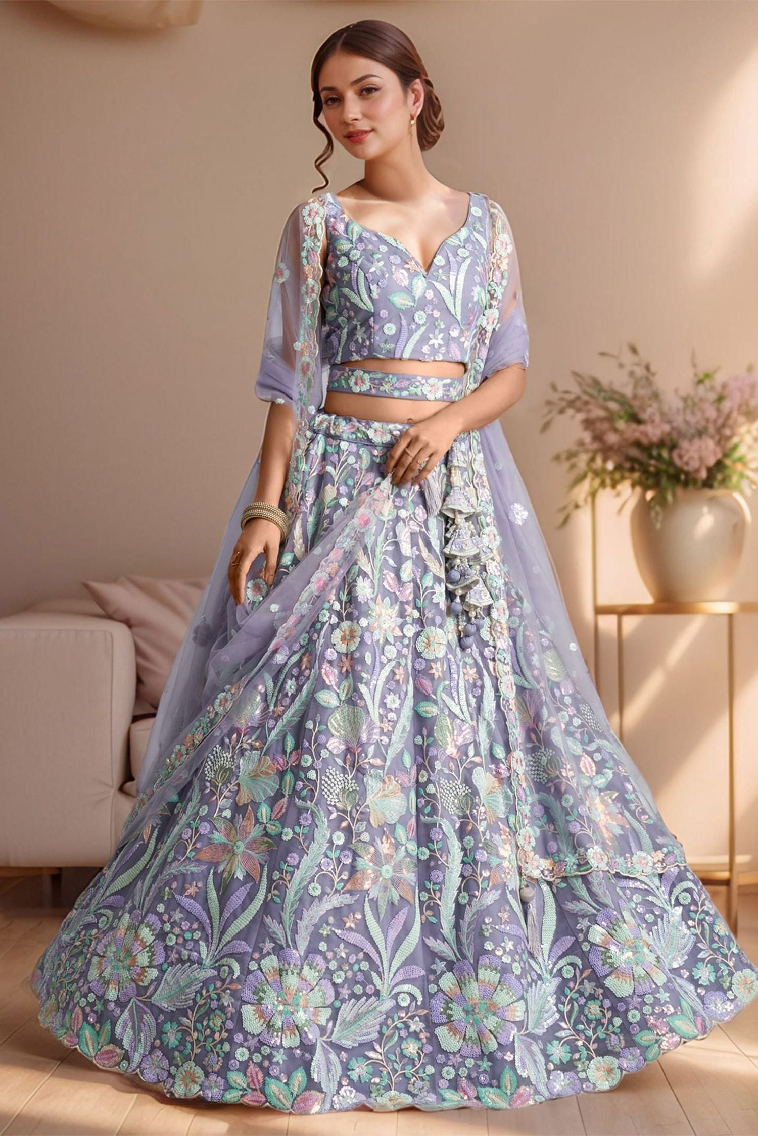 Paired beautifully with a soft net dupatta measuring 2.40 meters, this ensemble is finished with dainty floral embroidery and delicate sequins. Light, airy, and feminine, this lavender lehenga is ideal for receptions, sangeet nights, or elegant festive celebrations.