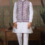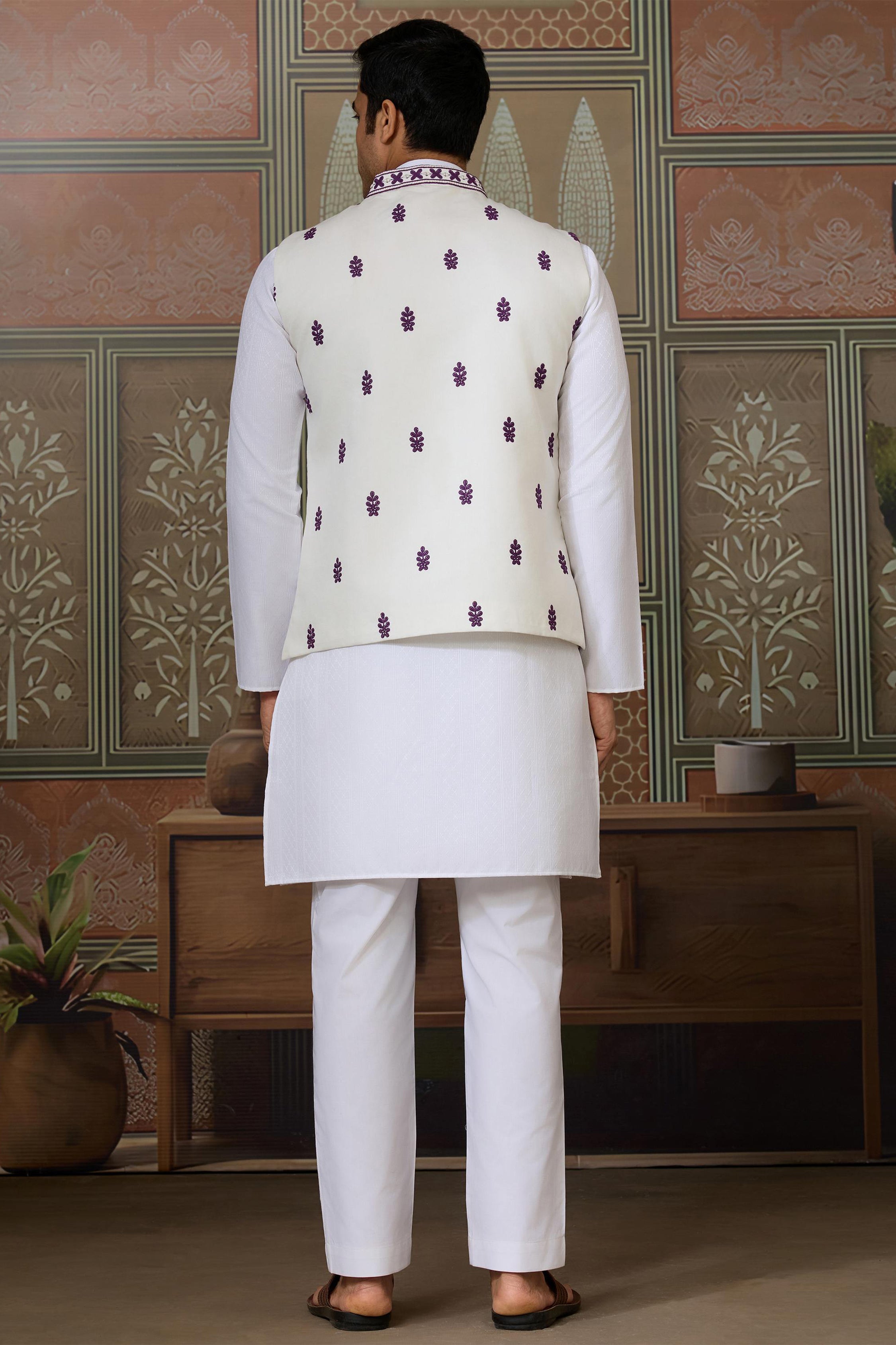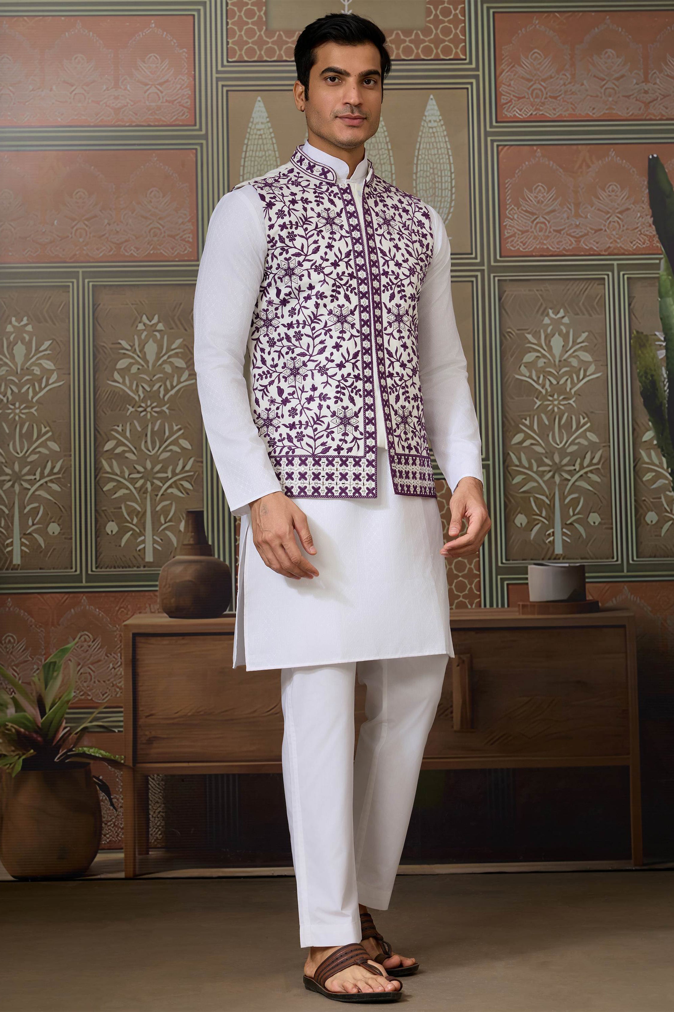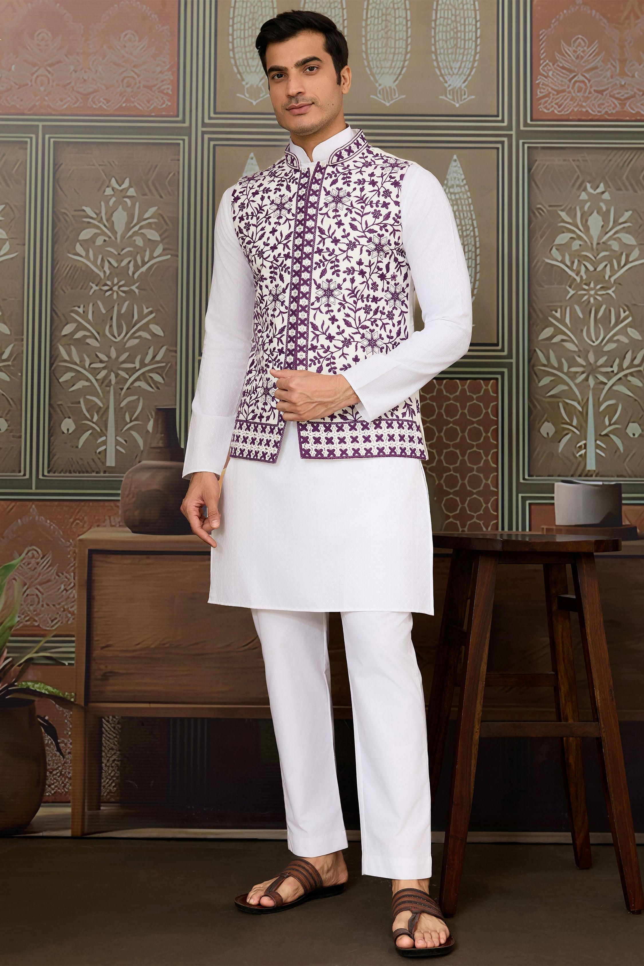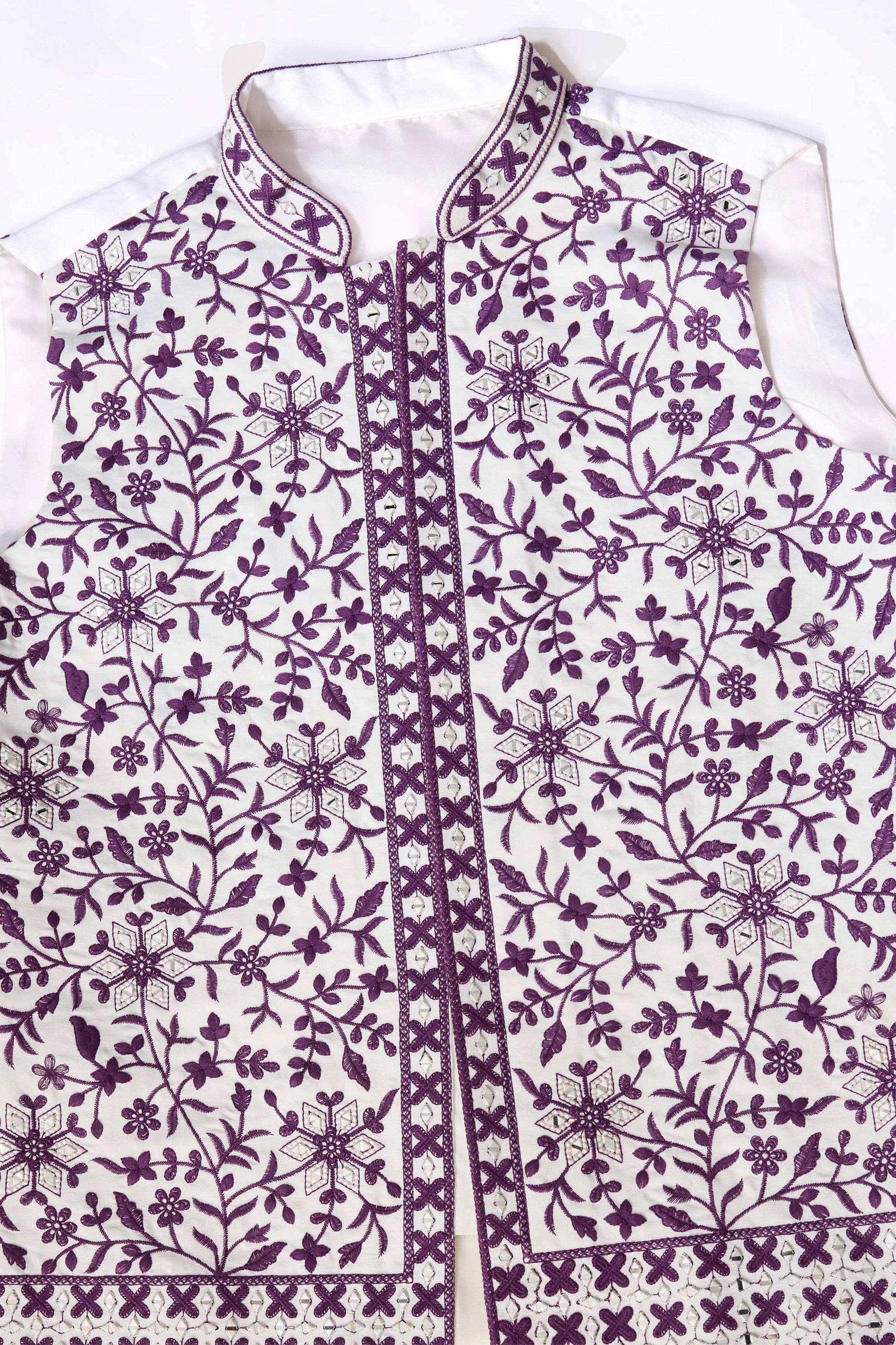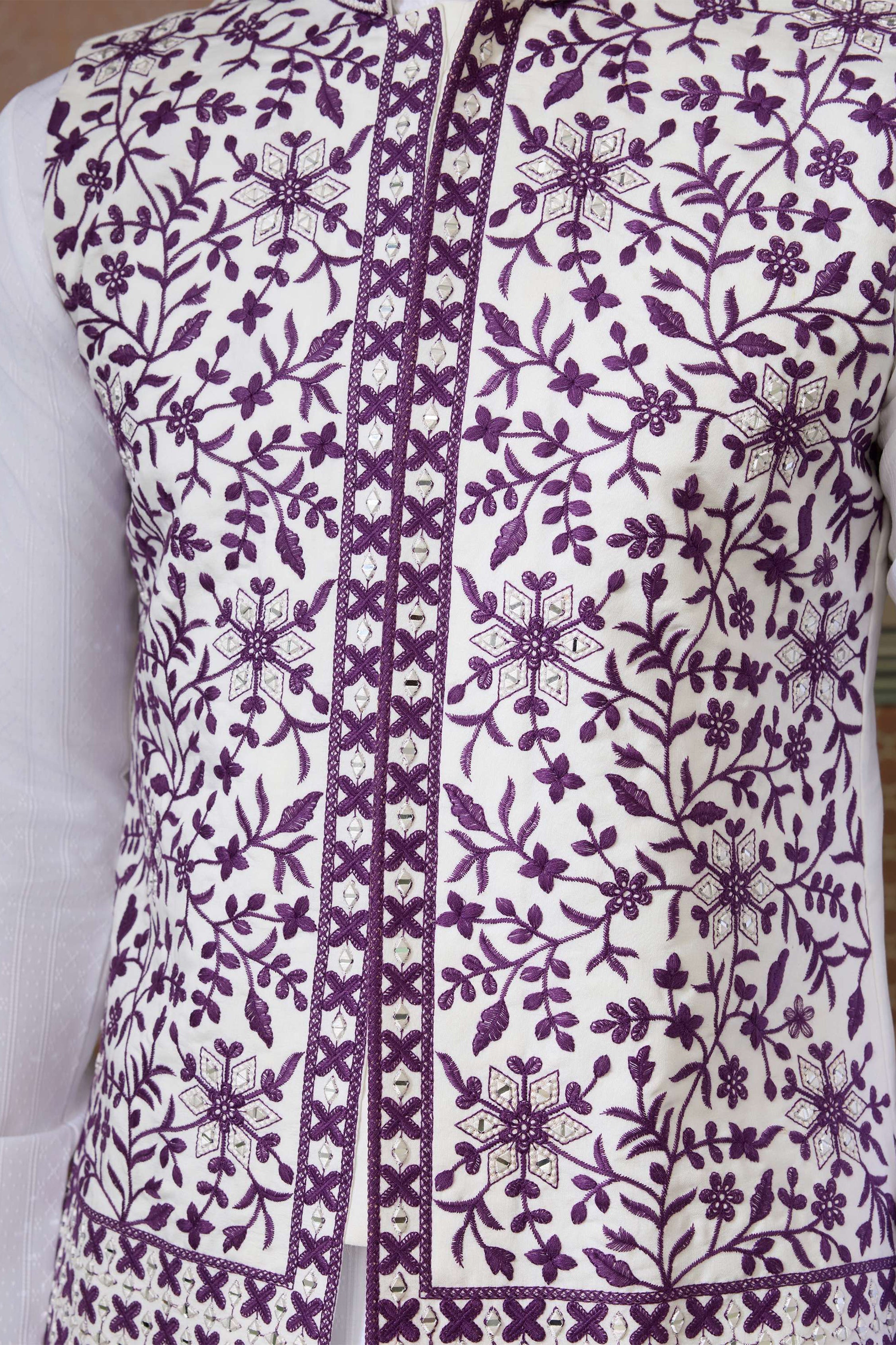 Nehru jacket featuring intricate thread and mirror embroidery in rich purple hues against a pristine white base. The floral vines and geometric star motifs create a timeless aesthetic, highlighting the craftsmanship and elegance of the piece.