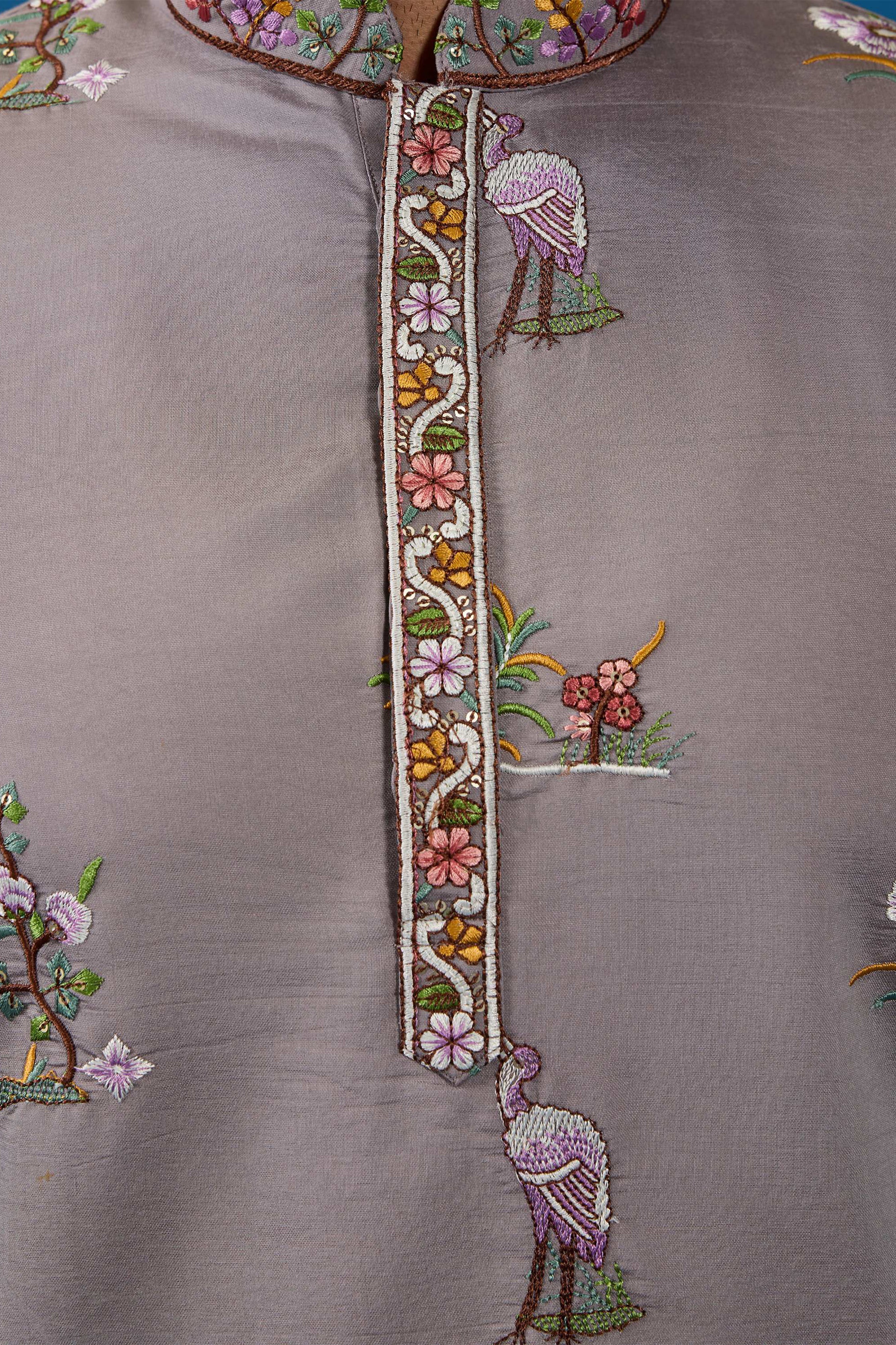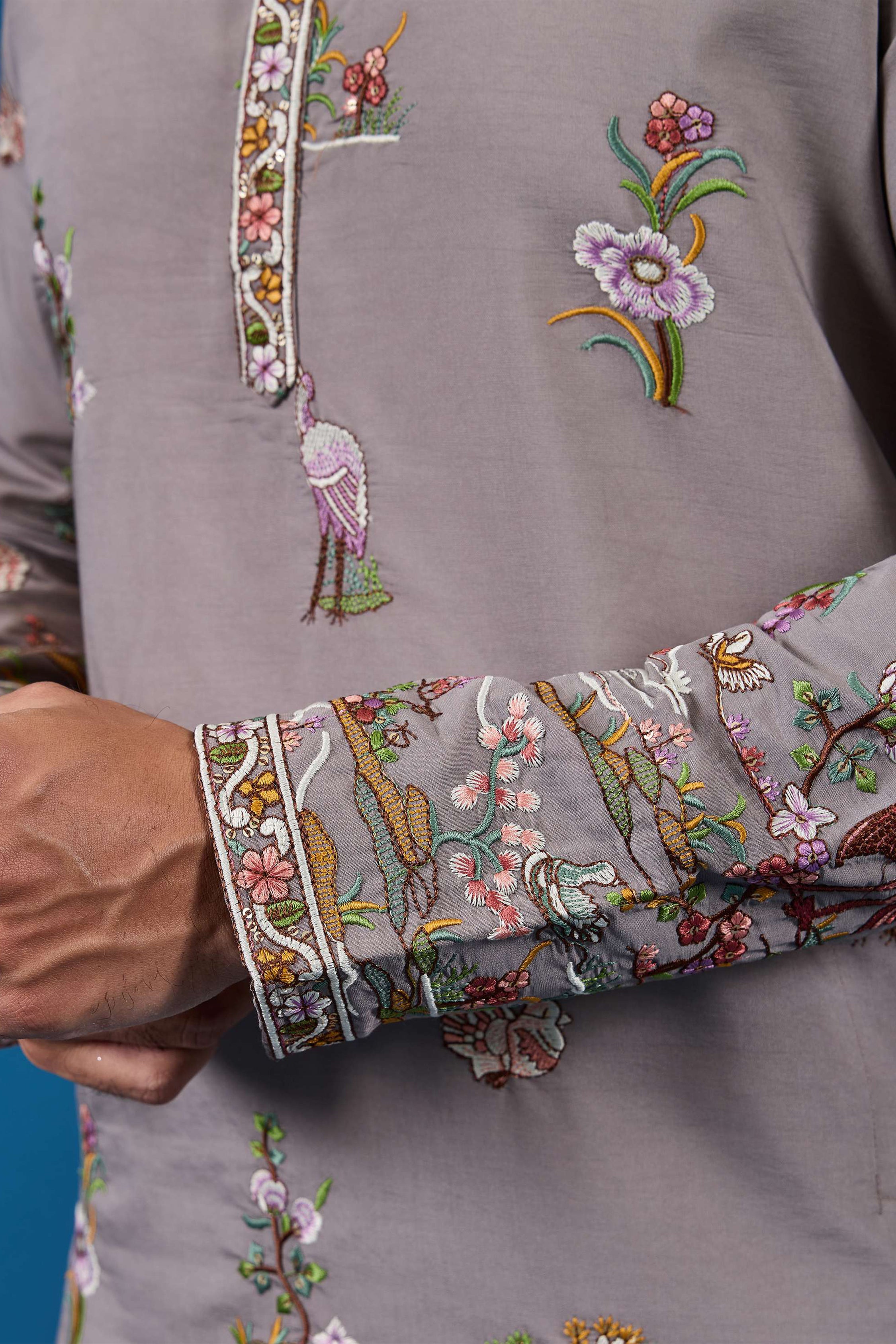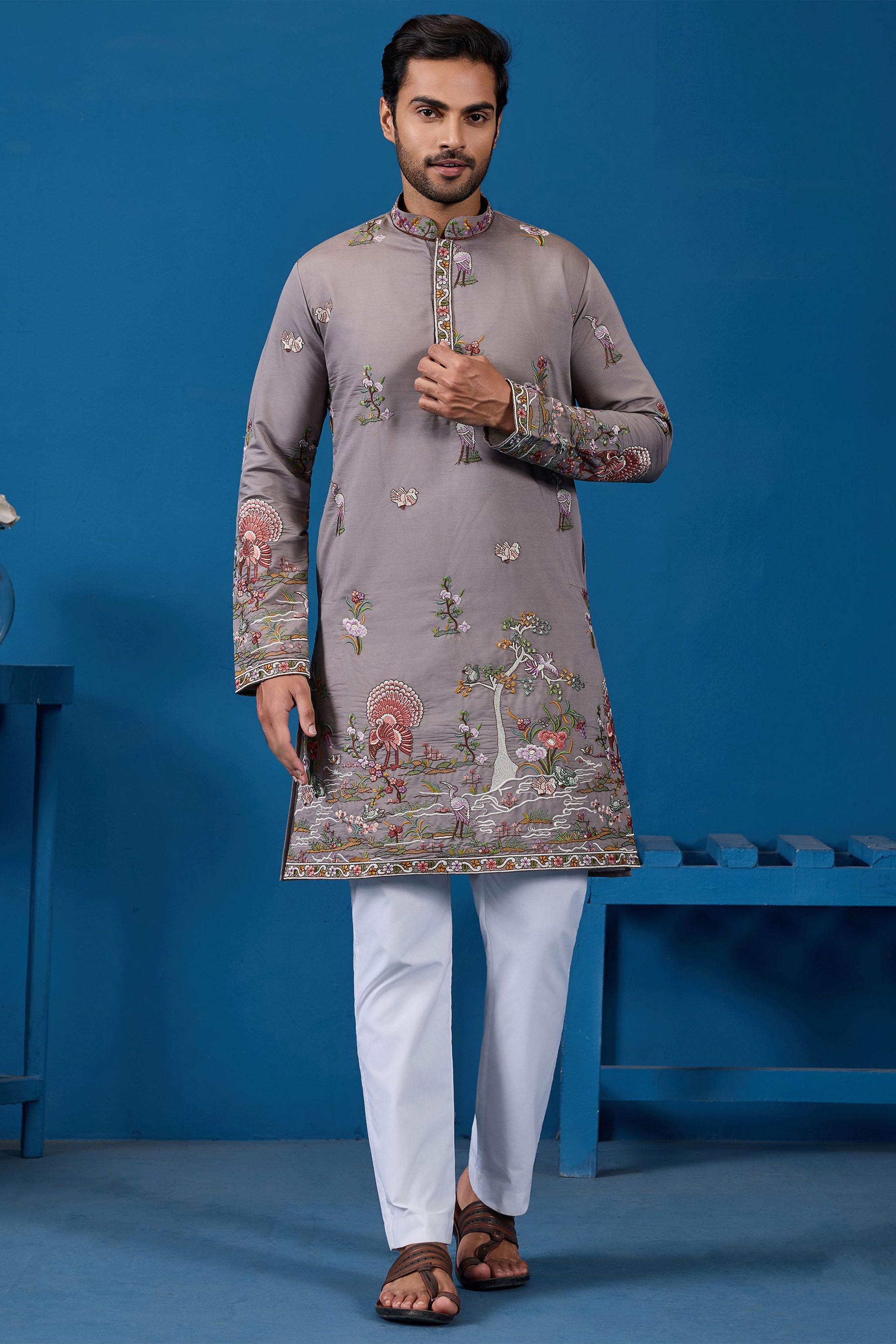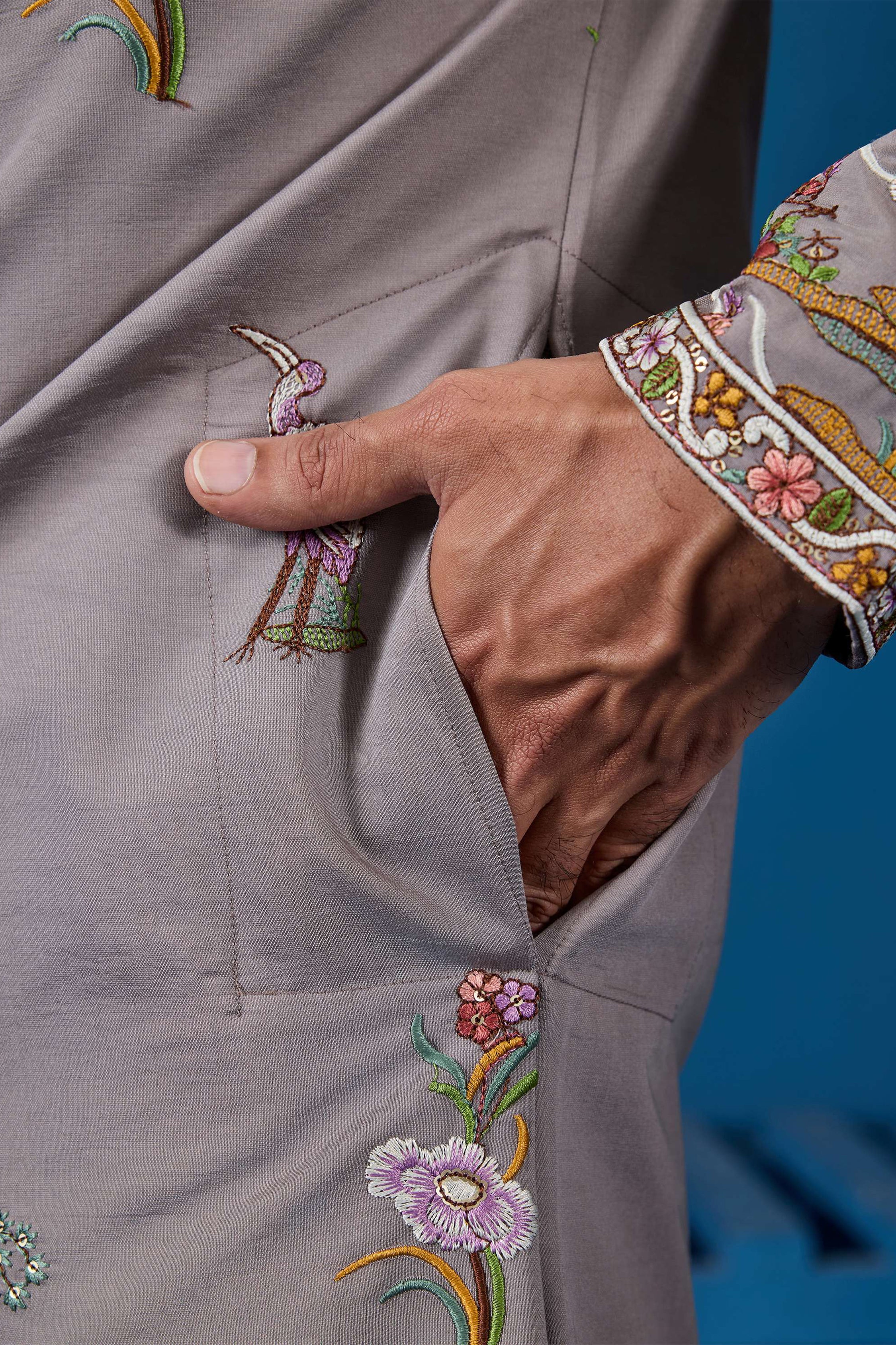 The grey kurta showcases motifs of birds, florals, and nature-inspired patterns, giving it a regal and artistic character. The embroidered neckline and cuff detailing add an extra touch of elegance, while the straight hem with heavy border work enhances the overall richness. Men’s kurta in a sophisticated grey shade, beautifully enriched with intricate multi-color thread embroidery across the front, sleeves, and borders. The ensemble creates a graceful and polished festive look perfect for weddings, celebrations, and cultural events.
