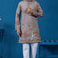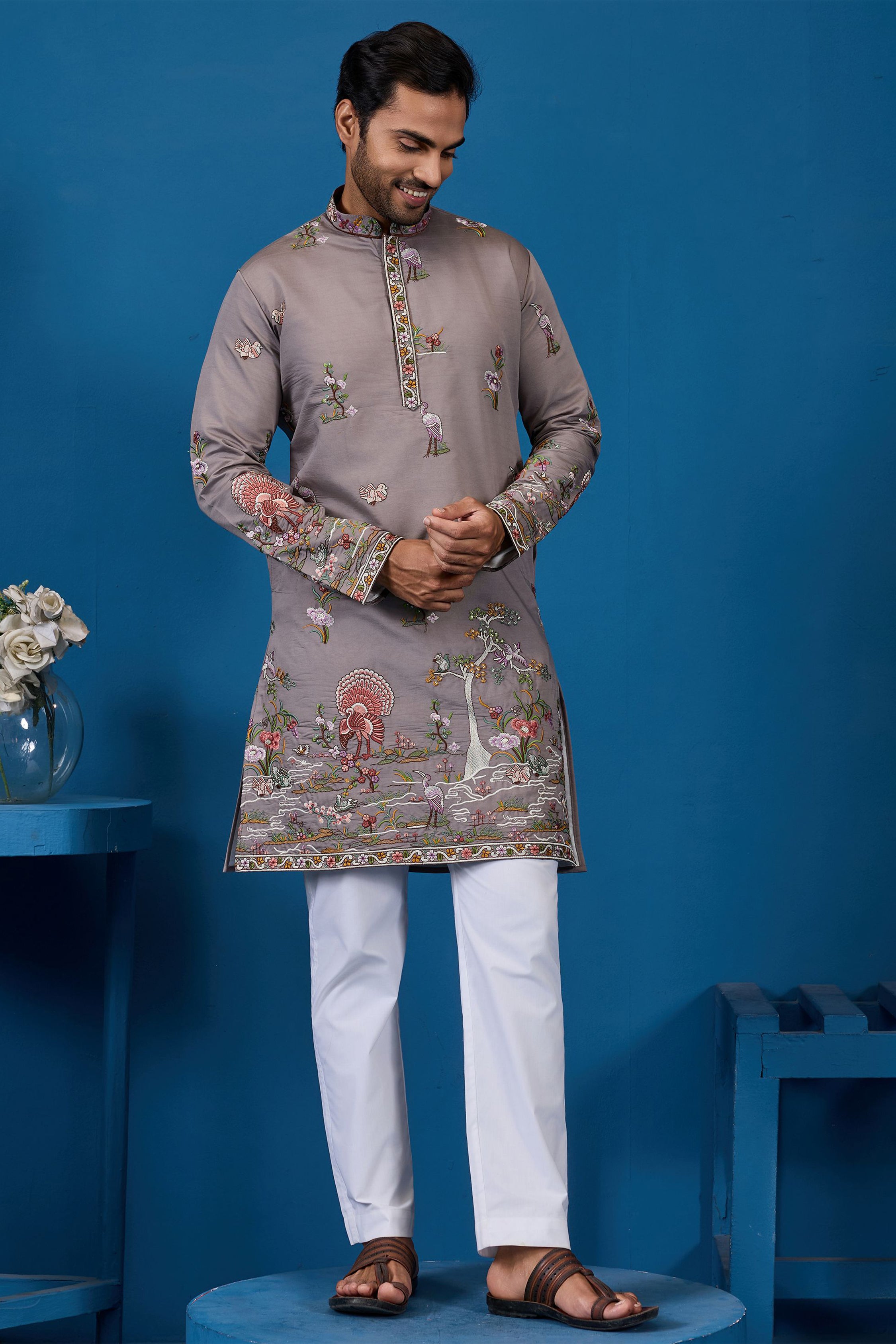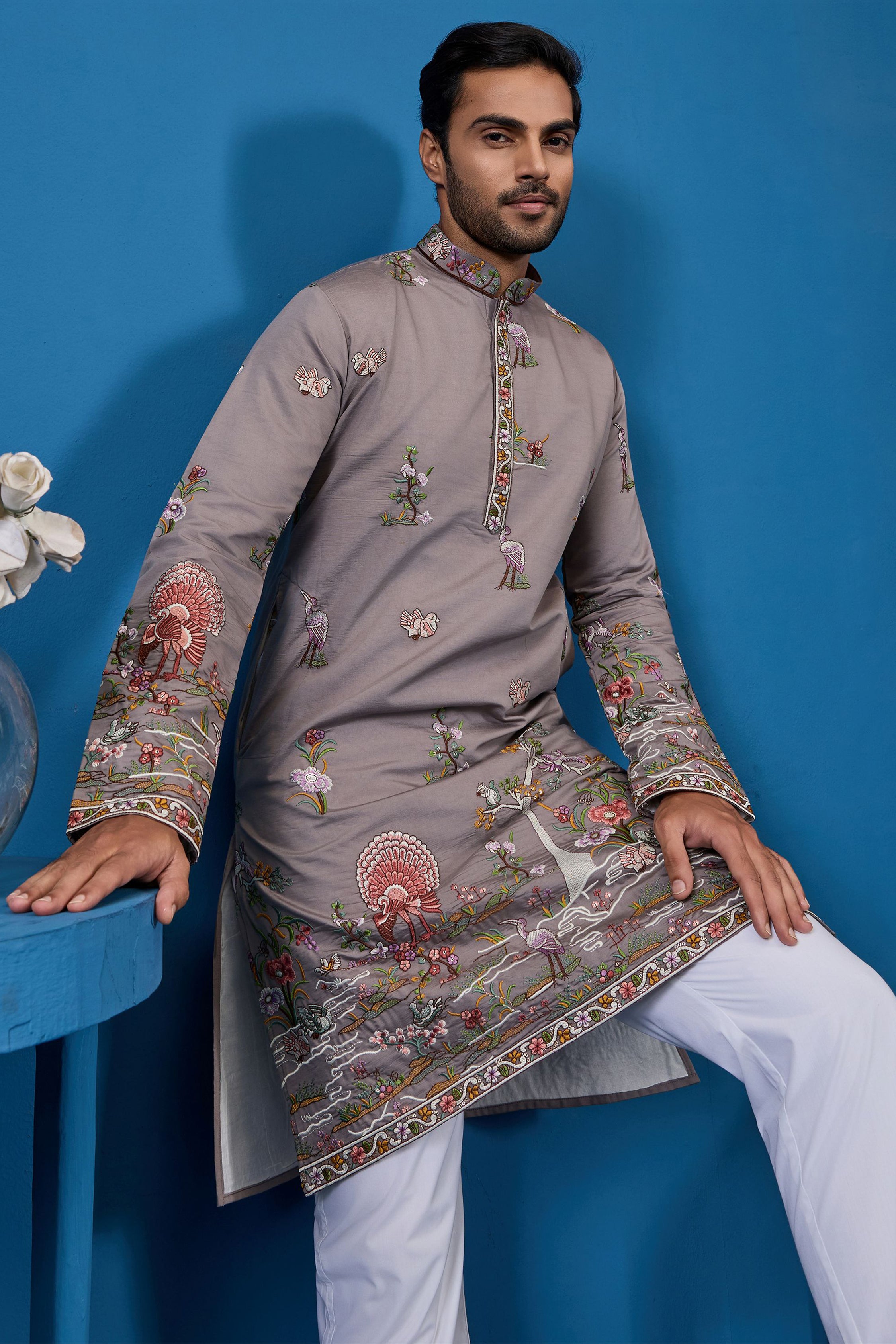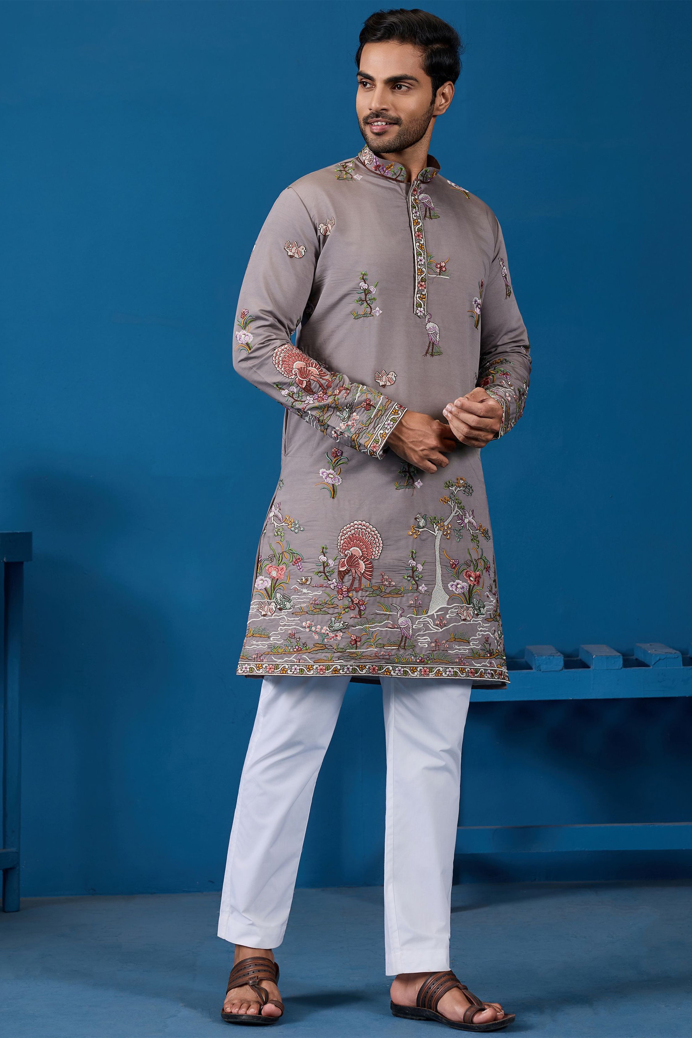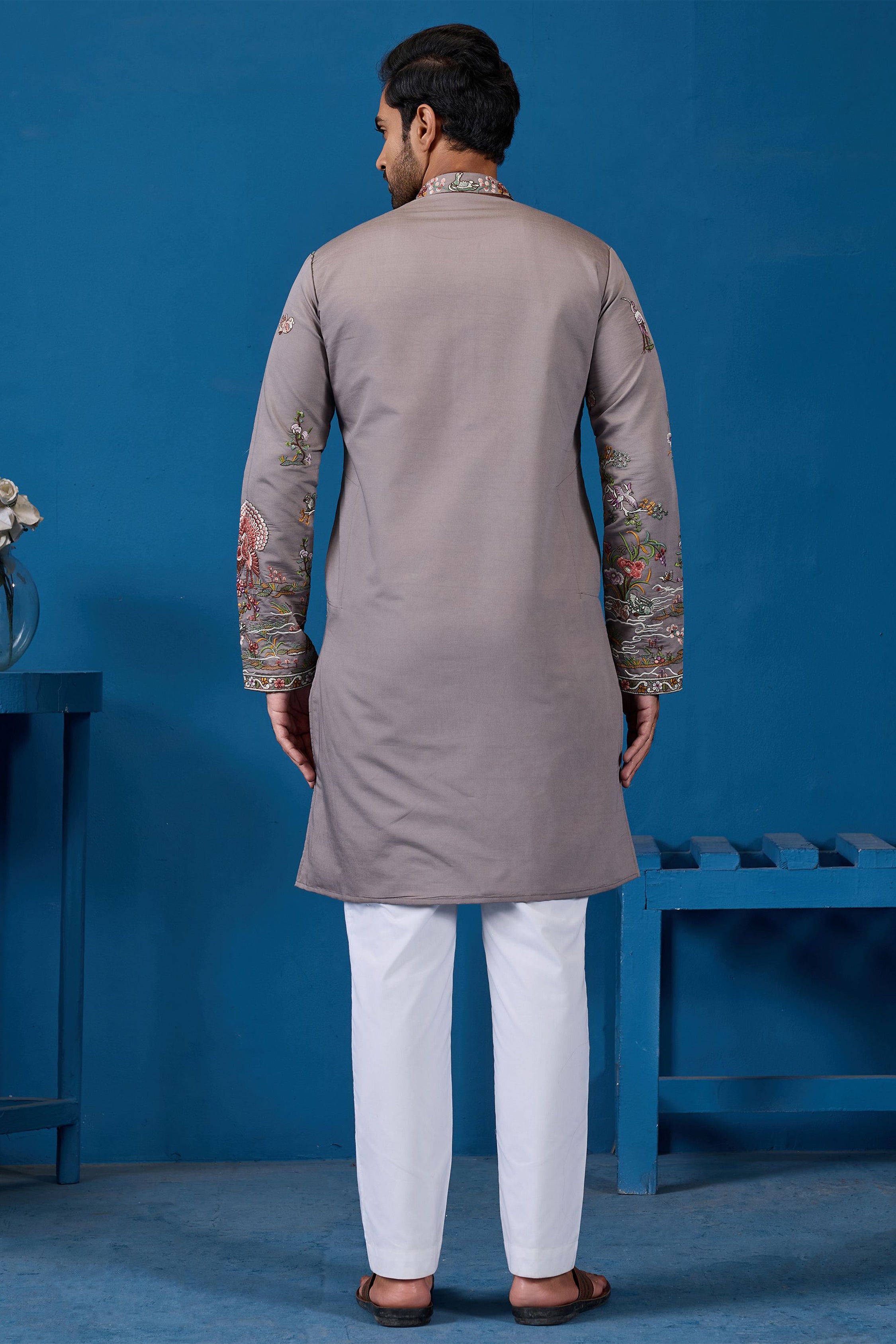 The grey kurta showcases motifs of birds, florals, and nature-inspired patterns, giving it a regal and artistic character. The embroidered neckline and cuff detailing add an extra touch of elegance, while the straight hem with heavy border work enhances the overall richness. Men’s kurta in a sophisticated grey shade, beautifully enriched with intricate multi-color thread embroidery across the front, sleeves, and borders. The ensemble creates a graceful and polished festive look perfect for weddings, celebrations, and cultural events.