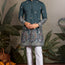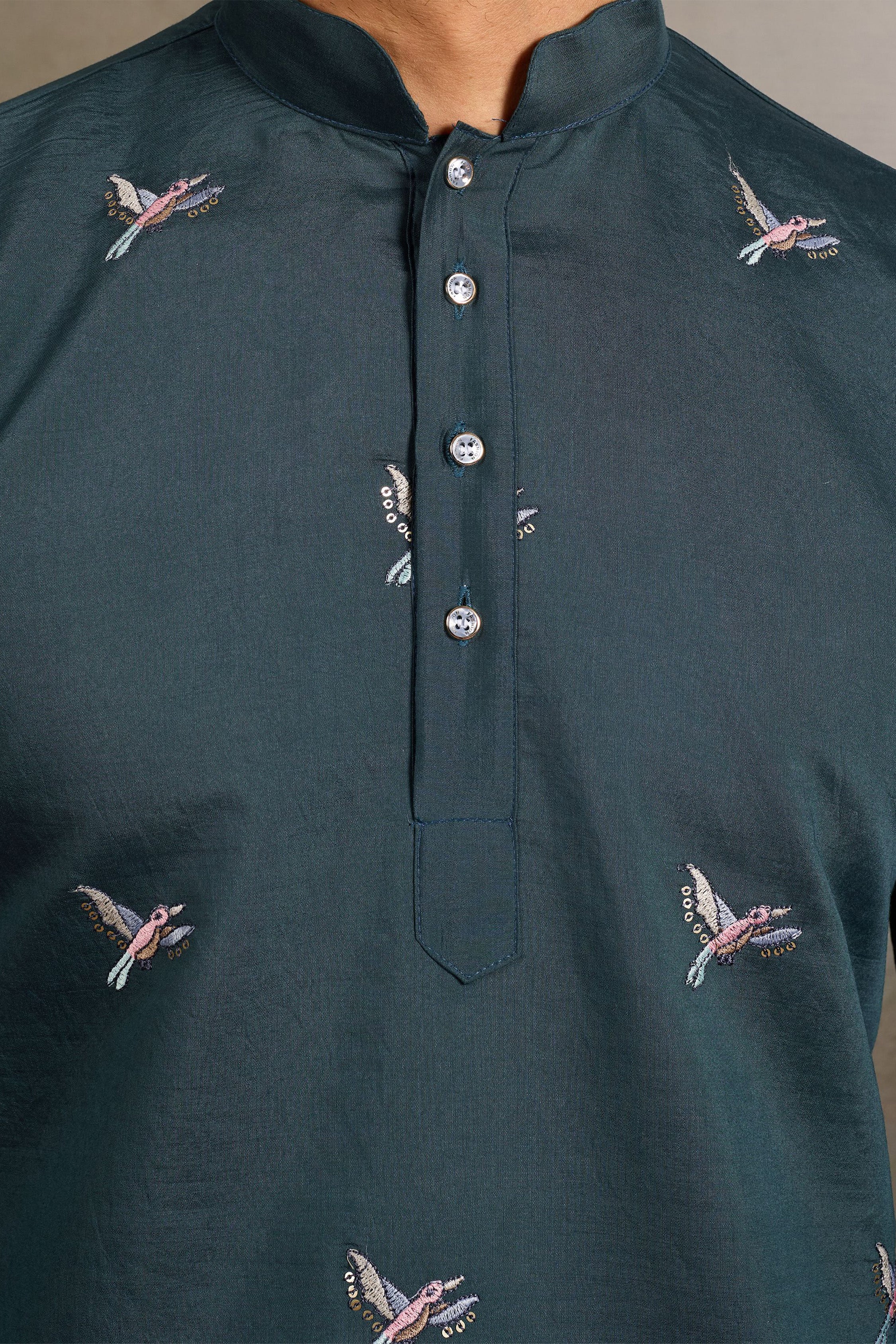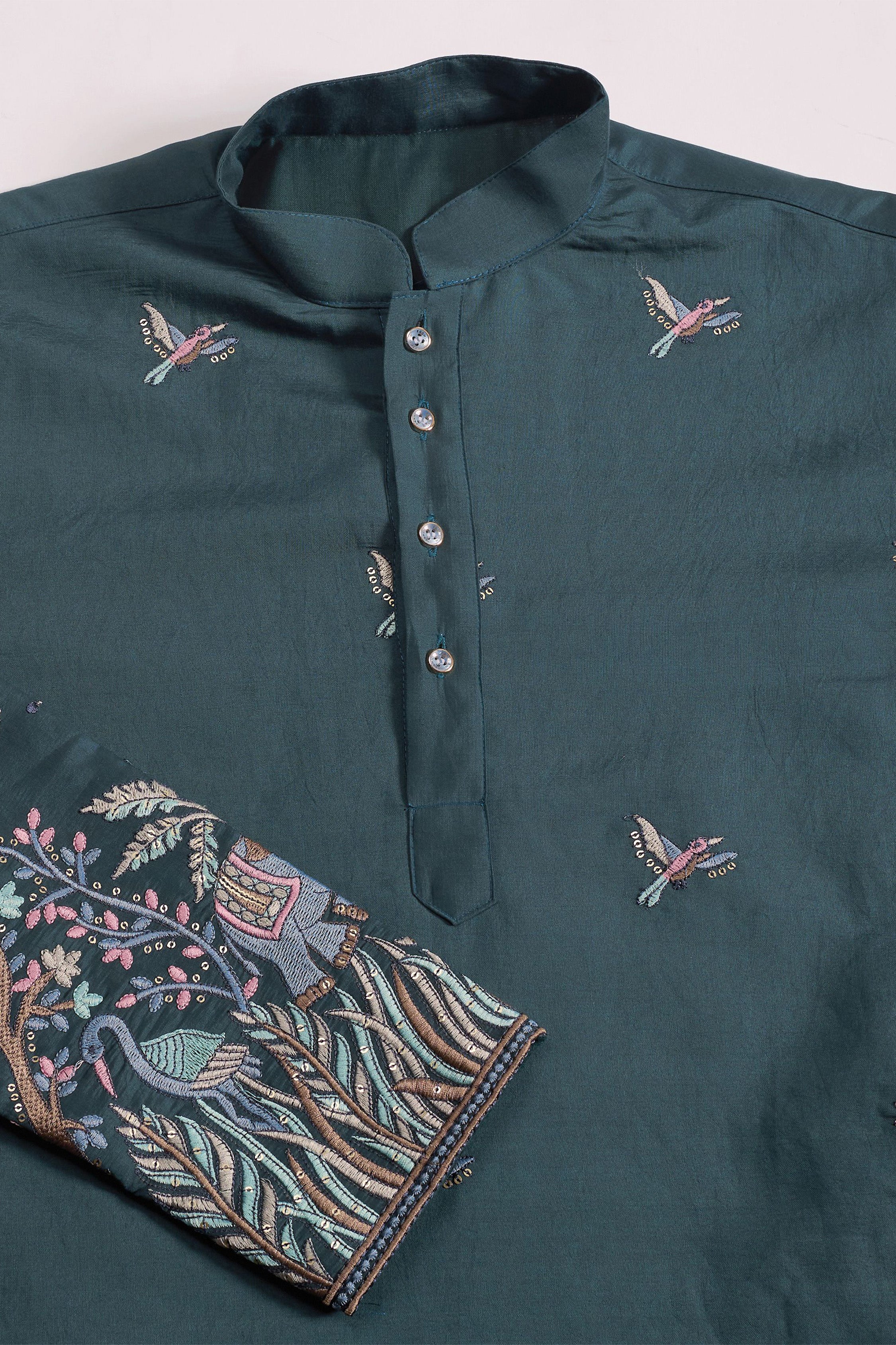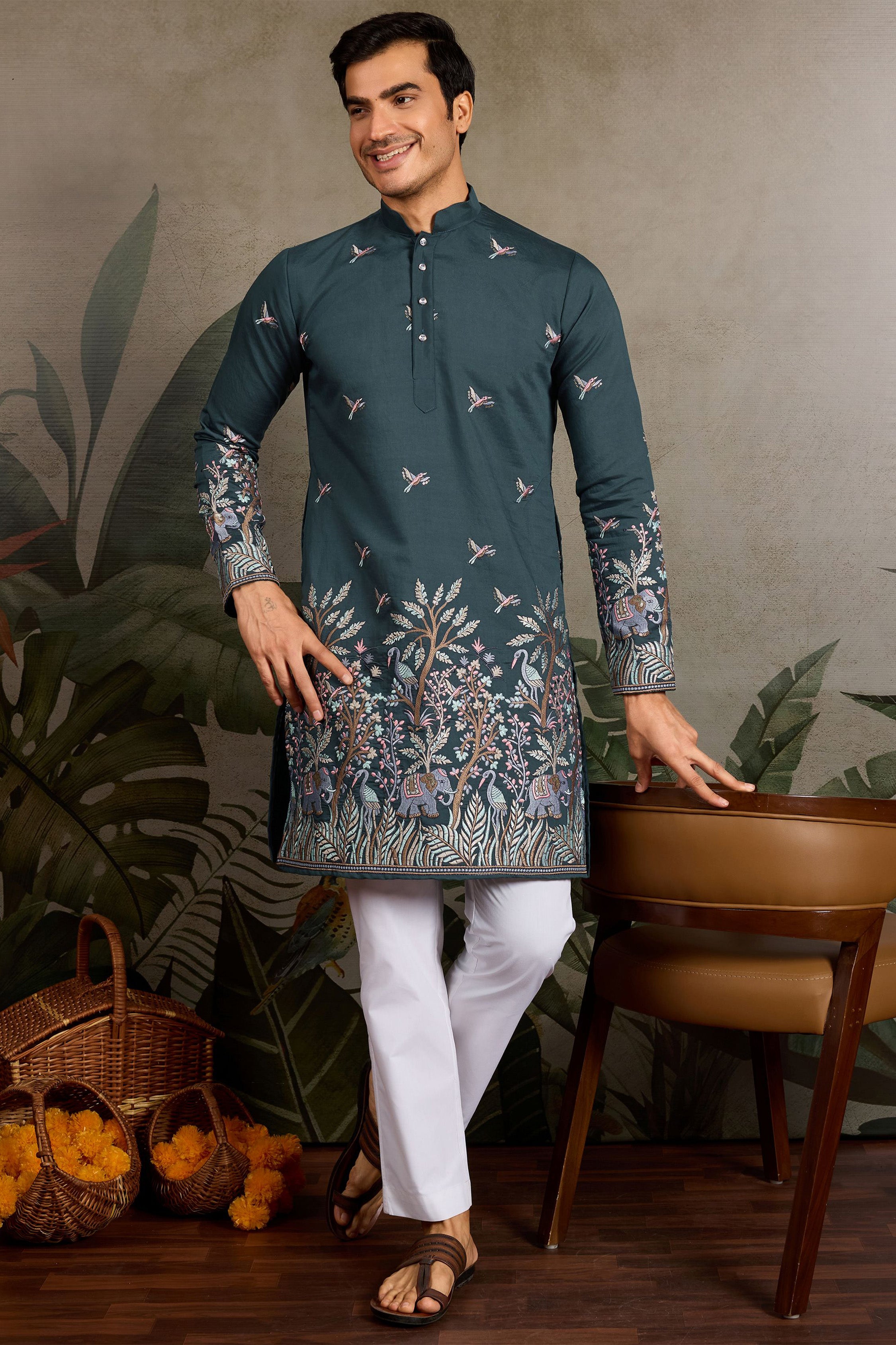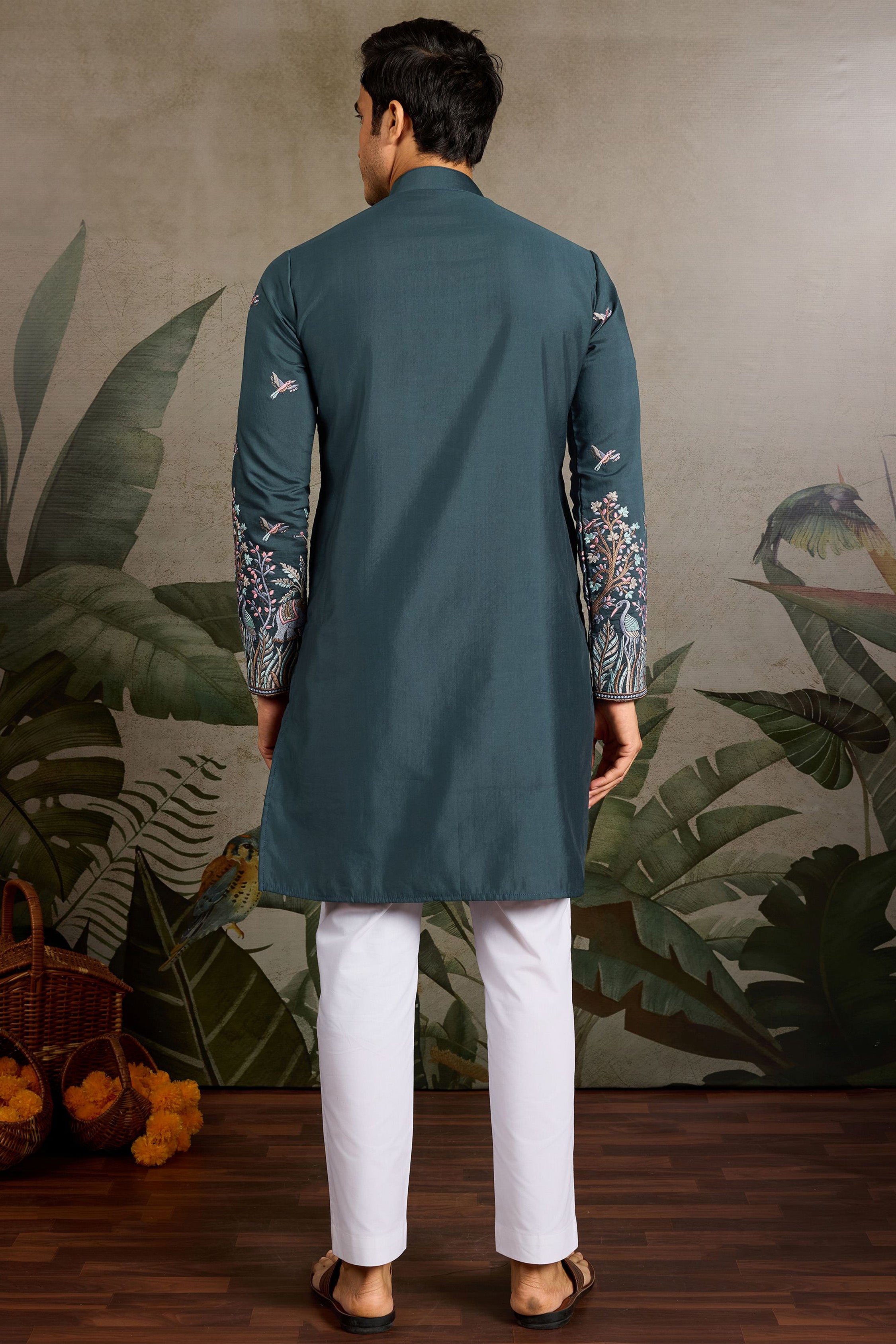 Precious Teal Green Thread Embroidered Viscose Silk Men Kurta