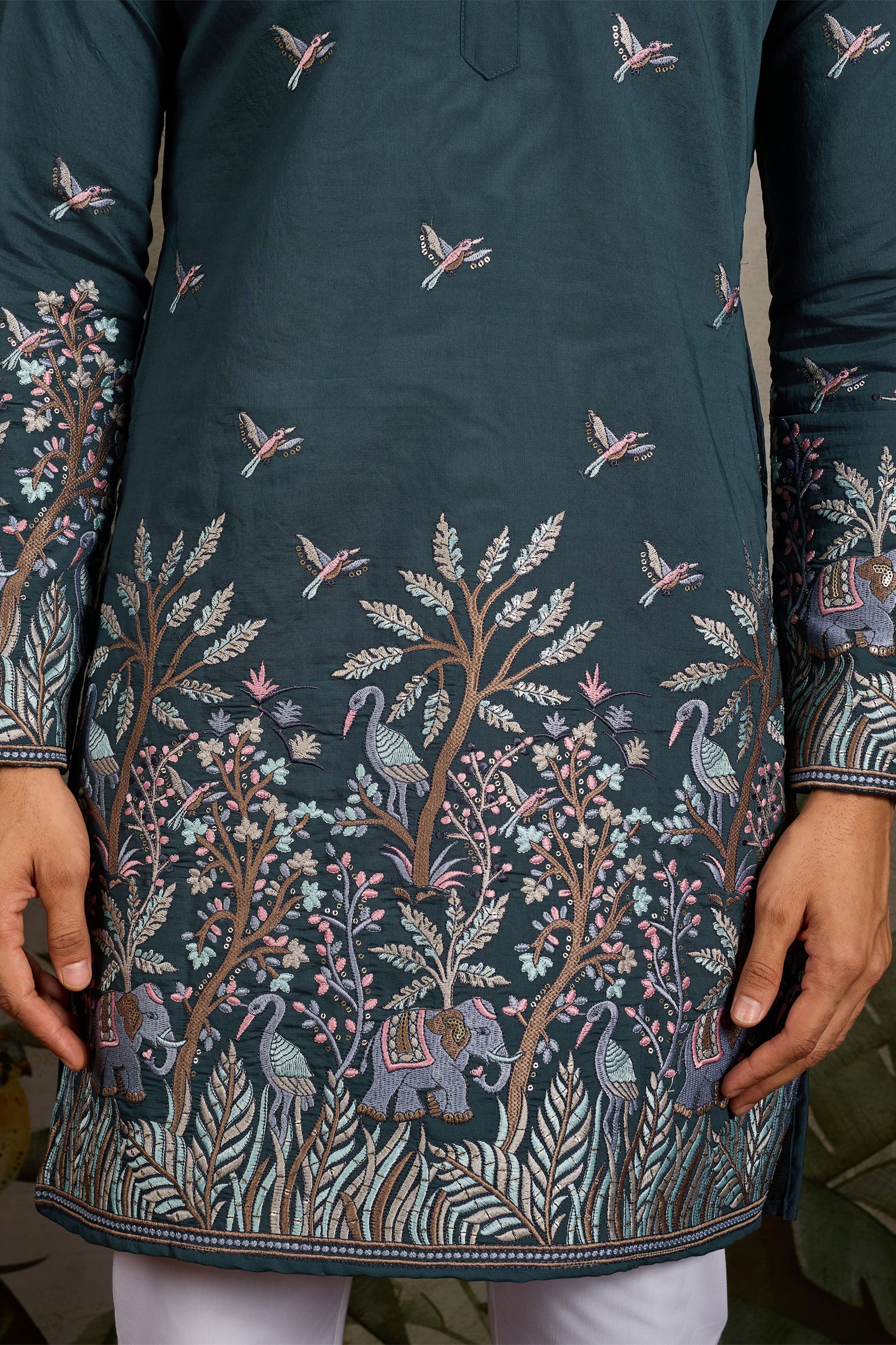 This viscose silk kurta features exquisite thread embroidered work, showcasing a rich forest-inspired design with birds, elephants, and foliage intricately crafted along the hem and sleeves. Delicate flying bird motifs are scattered across the upper body, adding subtle charm, while the detailed sleeve cuffs and neckline elevate the overall elegance, making it a perfect blend of tradition and refined artistry.