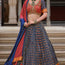Step into a world of timeless elegance with this mesmerizing navy blue lehenga, a perfect choice for making any occasion unforgettable. The exquisite bandhani foil print brings a fresh and radiant look, merging traditional artistry with modern style for a truly stunning appearance.