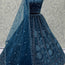 The lehenga is a stunning deep teal blue ensemble, richly embellished with intricate sequin and thread embroidery throughout. The patterns feature a mix of geometric and heart motifs, creating a beautiful traditional yet contemporary design.