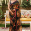 This saree is an elegant black drape featuring a striking multicolor floral print that enhances its charm. The saree is highlighted with a subtle shimmer effect and finished with a contrasting pink border, adding a touch of sophistication. The lightweight fabric makes it graceful for festive occasions, evening gatherings, or celebrations.