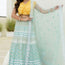 This ensemble features a refreshing sky blue organza lehenga adorned with intricate silver and golden embroidery in geometric and floral-inspired patterns. The lehenga flares beautifully, showcasing rows of zigzag designs, diamond lattice work, and small motifs that add depth and elegance.