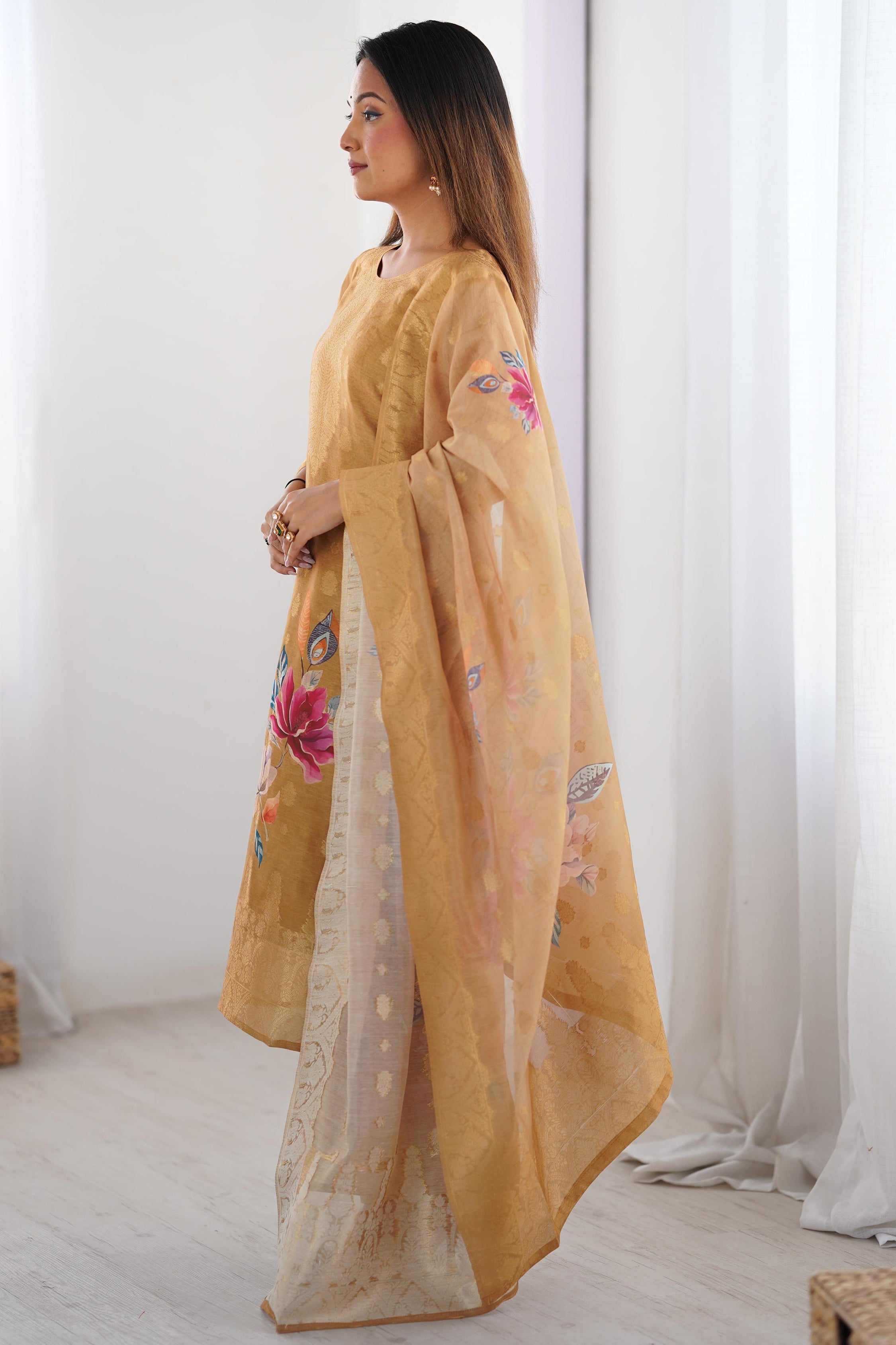 This cream color Chanderi fully stitched suit, gracefully adorned with jacquard detailing and delicate floral print work. The soft Chanderi fabric offers a subtle sheen and lightweight feel, making it a refined choice for daytime festivities, casual gatherings, or cultural celebrations.
