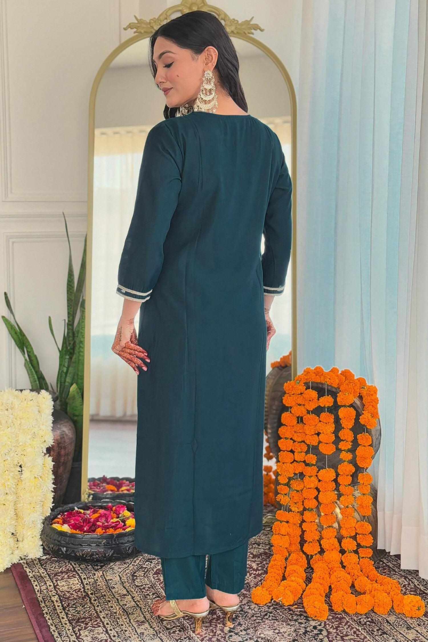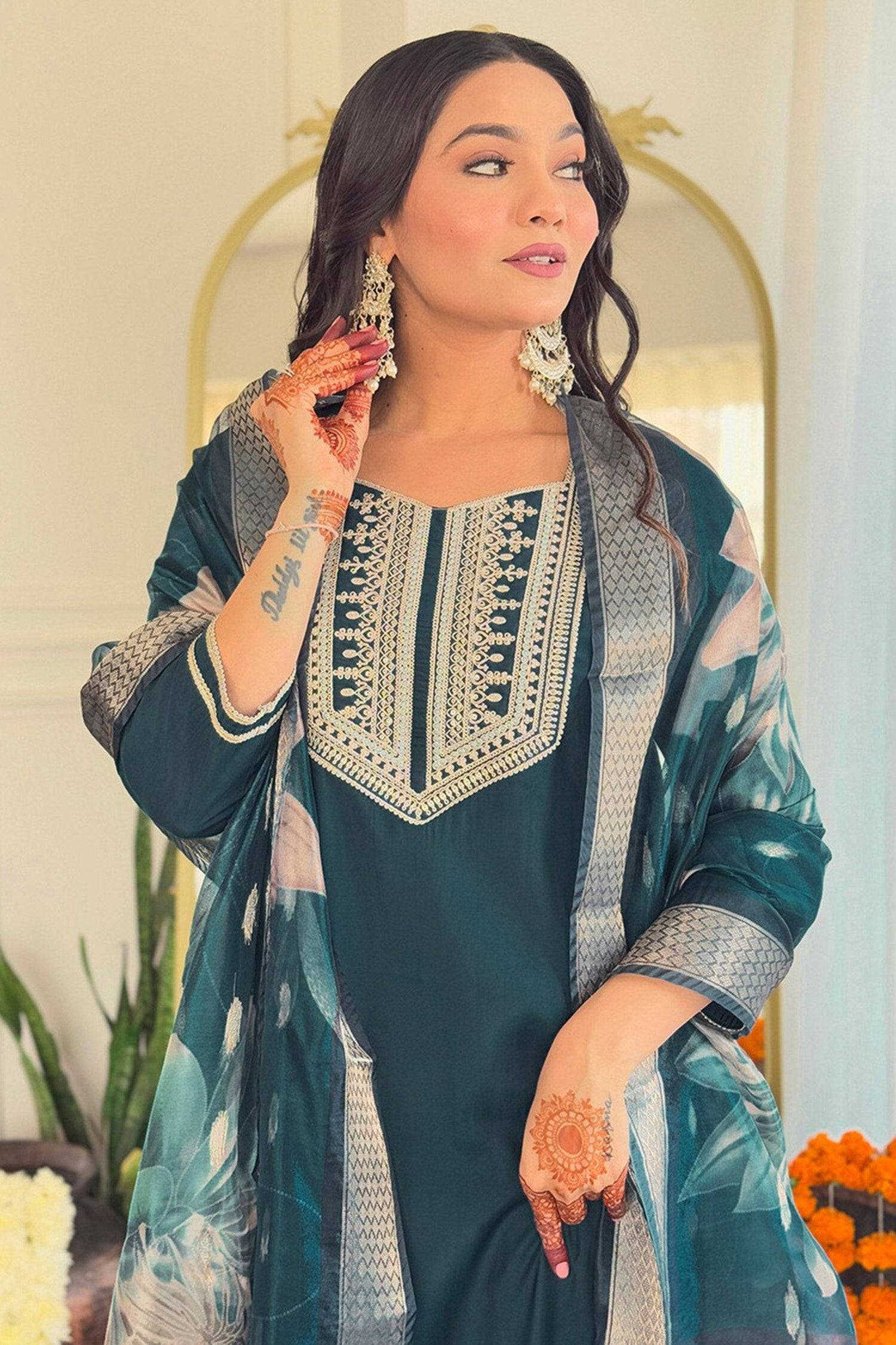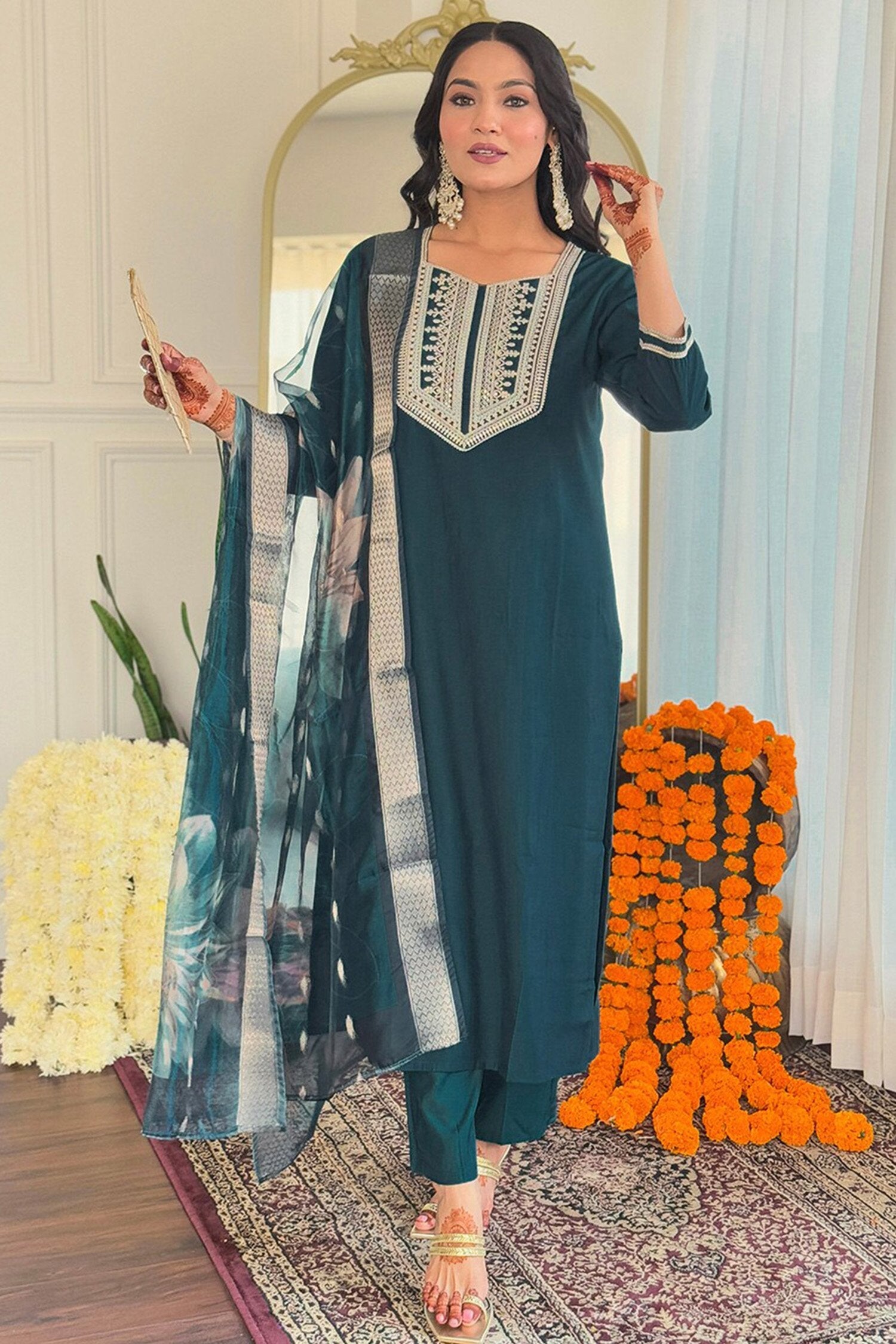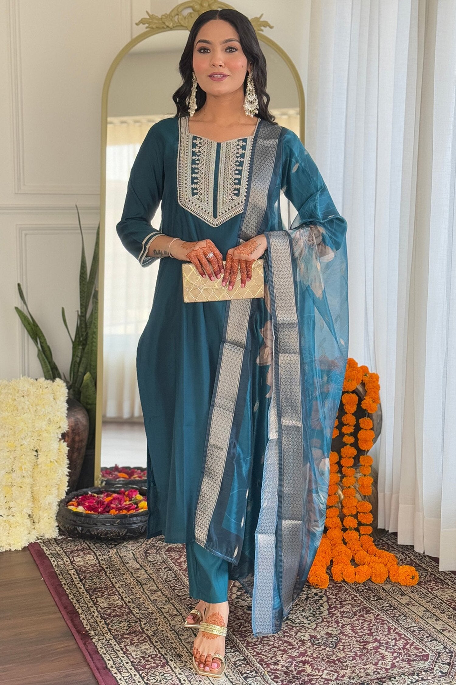 Step into a world of sophisticated charm with our stunning teal blue viscose suit. This meticulously crafted ensemble features intricate thread embroidery and shimmering sequin work, ensuring you make a lasting impression at any special occasion.