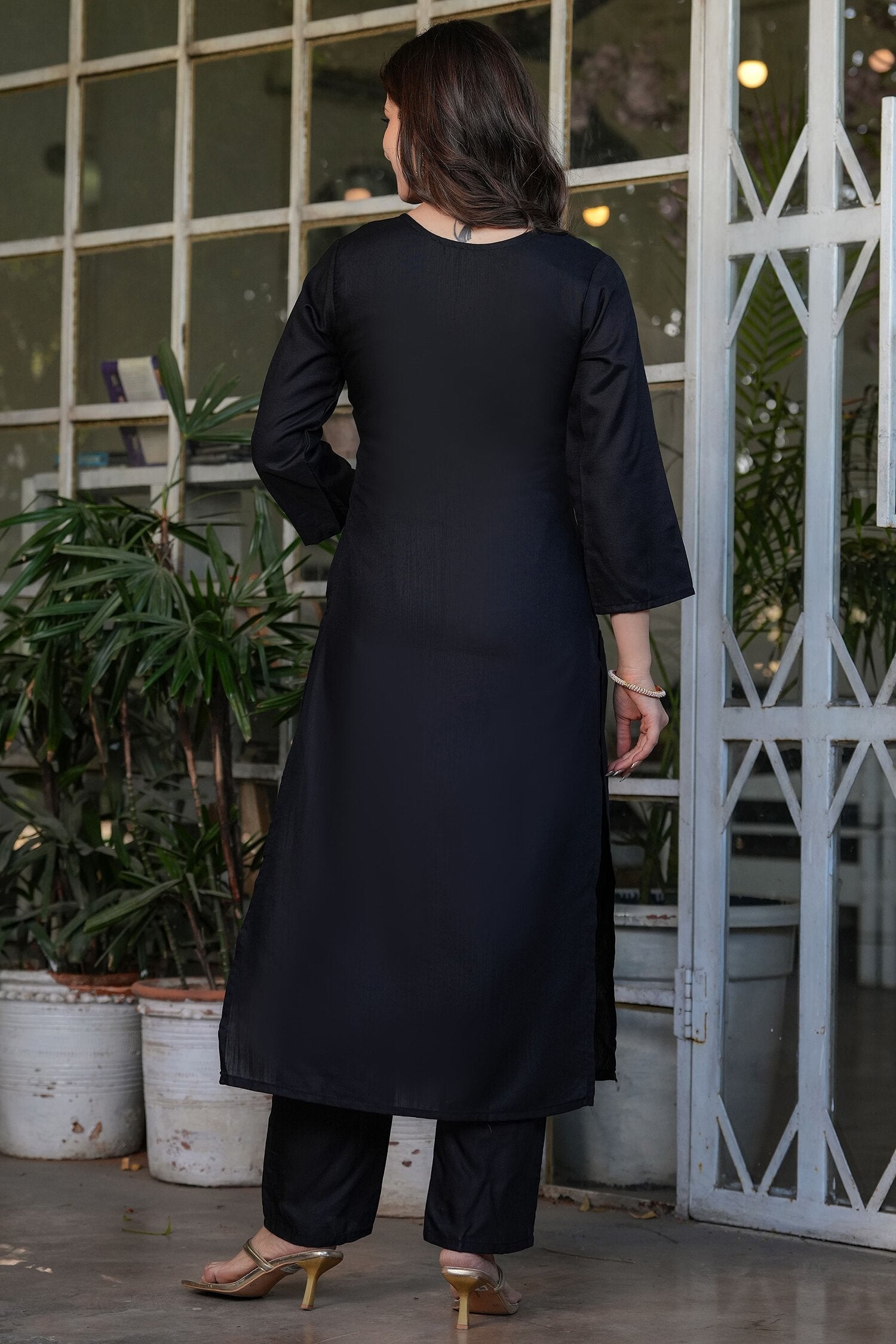This fully stitched black viscose suit features intricate thread embroidery on rich black fabric, adding a touch of elegance and sophistication. Available in sizes S to XXL, this suit is perfect for special occasions and festivals, combining traditional charm with modern style.