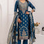The look is completed with a richly embellished teal-blue jacquard silk dupatta, showcasing graceful zari weaving and detailed border work. This refined addition enhances the overall elegance, making it a standout choice for any grand celebration.