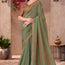 The georgette saree is crafted in a muted olive-green shade with a subtle sheen, creating a sophisticated and graceful look. The border is delicately embellished with intricate embroidery in golden and copper tones, adding richness to the design.