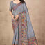 Complementing the saree, the matching grey pashmina silk blouse features a chic design enriched with beautiful handwork motifs and crystal detailing. This elegant blouse adds a refined touch, ensuring you stand out on any occasion, whether it's a grand celebration or an intimate gathering.