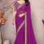 This stunning purple color georgette saree, featuring graceful print work and a beautifully detailed thread embroidery lace border. The lightweight georgette fabric drapes effortlessly, offering a flowy silhouette that’s perfect for festive occasions and cultural gatherings.