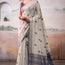 Paired with a sophisticated grey cotton blouse, the ensemble strikes a graceful balance between minimalism and tradition. The muted tones blend seamlessly, offering a timeless look that speaks of quiet sophistication and effortless style.