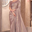 The saree is made from luxurious crepe fabric, giving it a soft, fluid drape with a subtle sheen. The muted champagne-light brown tone enhances its sophisticated appeal. It features an intricately embellished border and pallu with sequins and threadwork in complementing shades, adding sparkle and depth to the outfit.