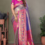 Complementing the saree is a beautiful rani pink banarasi silk blouse with matching zari weaving, adding a striking contrast to the ensemble. The unstitched blouse material allows for a customized fit, ensuring both comfort and a graceful look.