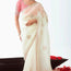 The saree is an elegant off-white organza fabric with delicate sequin and floral embroidery scattered throughout, giving it a sophisticated, ethereal look. The entire ensemble is styled with pearl jewellery, a neat bun adorned with flowers, and understated makeup to enhance the graceful, timeless appeal of this outfit.