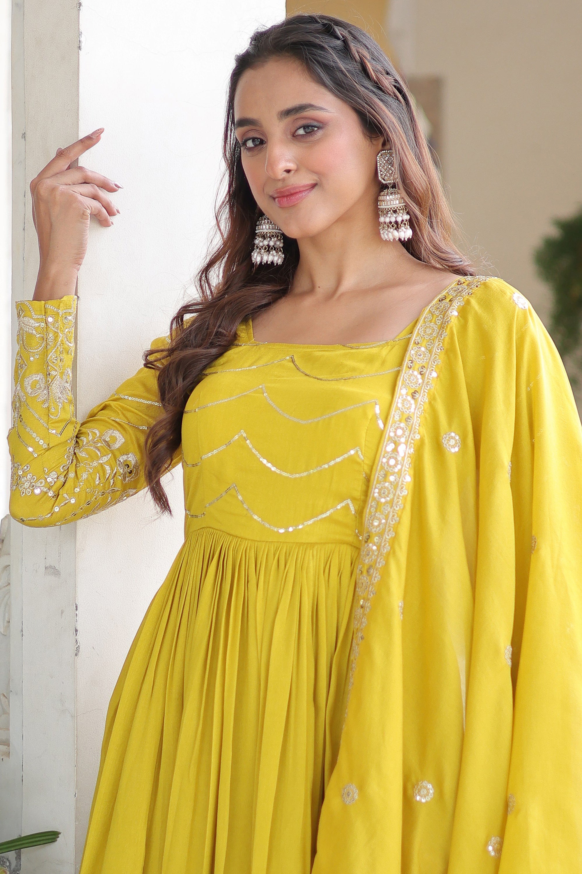 This stunning yellow Anarkali gown features an elegant square neckline with beautifully crafted sequin scallop patterns across the bodice. The long sleeves are adorned with intricate embroidery and shimmering detailing, while the flared skirt flows gracefully, showcasing a rich pleated fall and a finely embroidered border that adds a luxurious finish to the overall look.