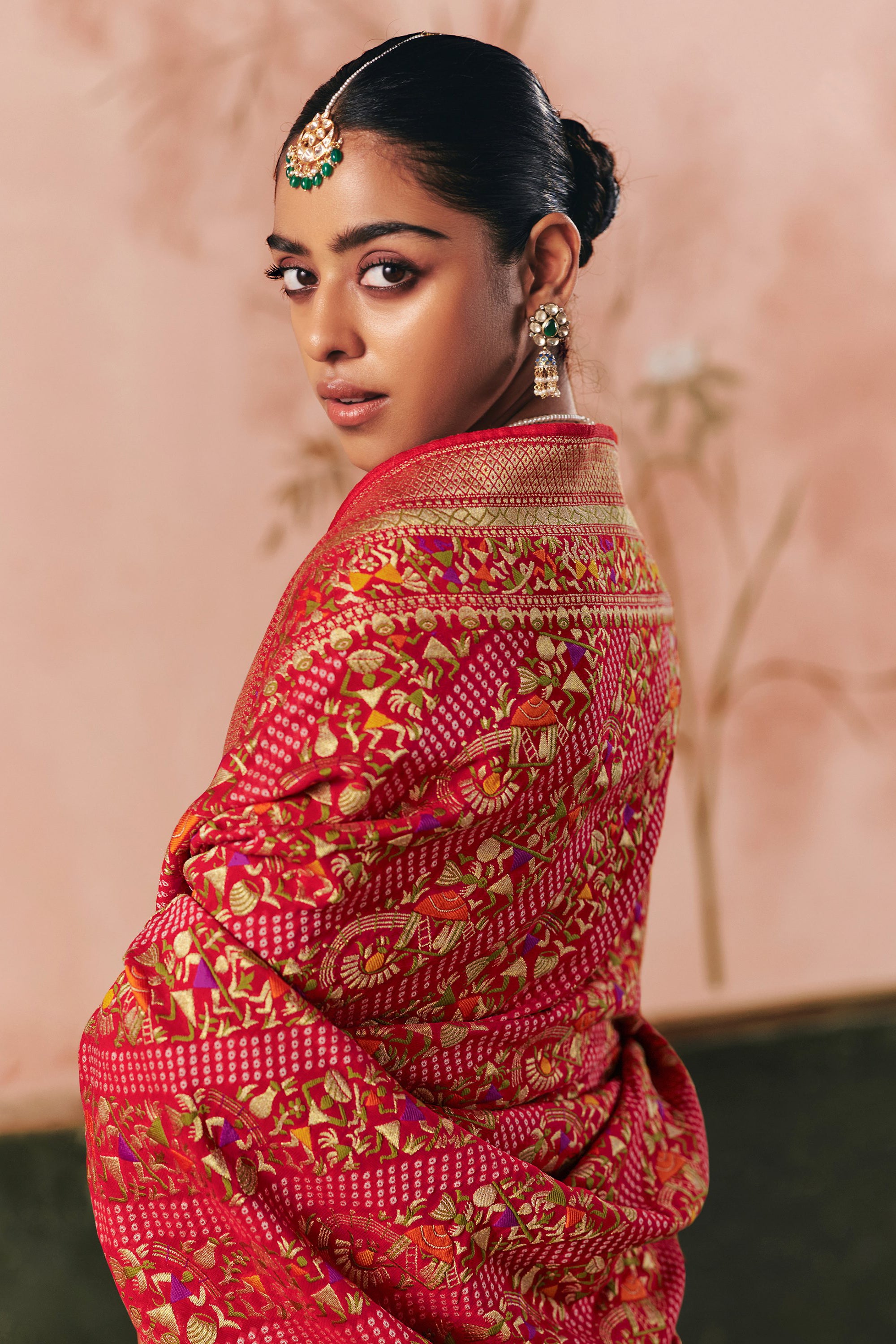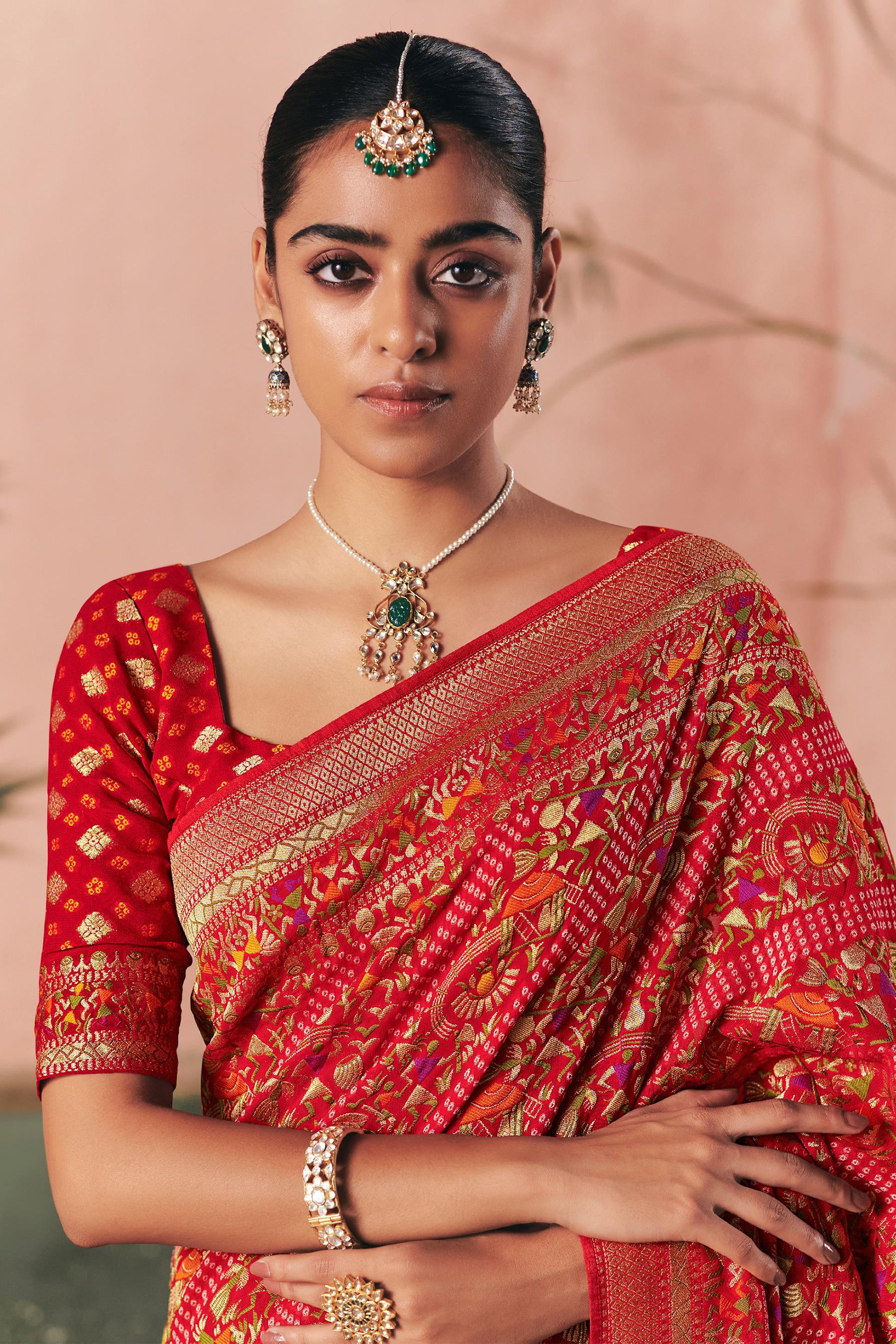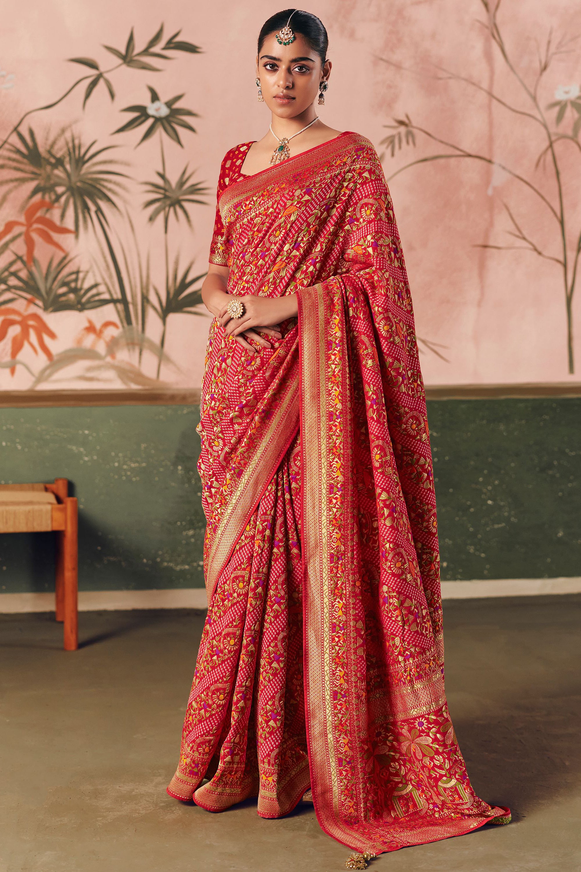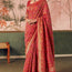 The red banarasi saree adorned with intricate zari weaving in gold, orange, and pink tones. The body features rich traditional motifs, including floral and geometric patterns, giving it a regal and festive appeal. The pallu and borders are heavily detailed with fine zari work, adding depth, richness, and a classic Banarasi grandeur perfect for weddings and traditional celebrations.