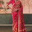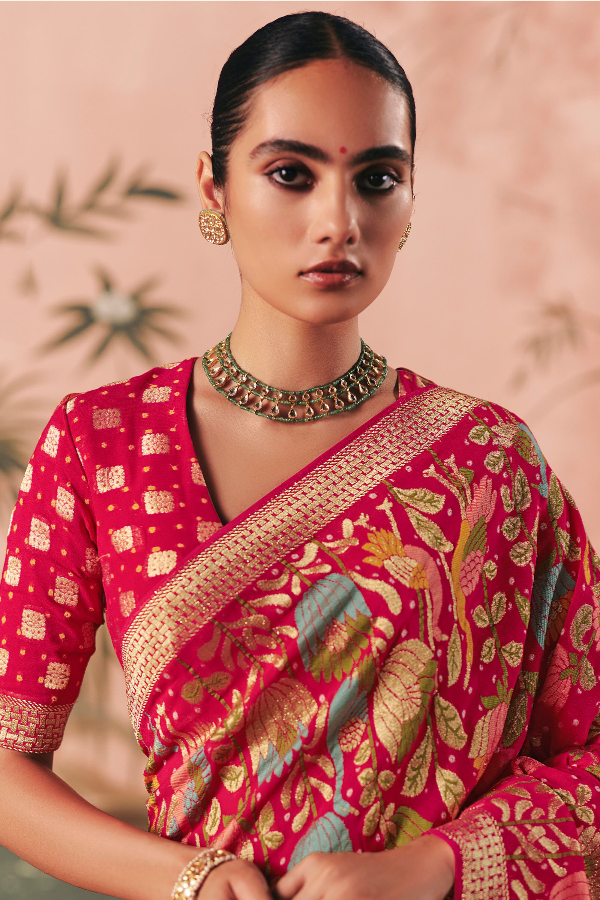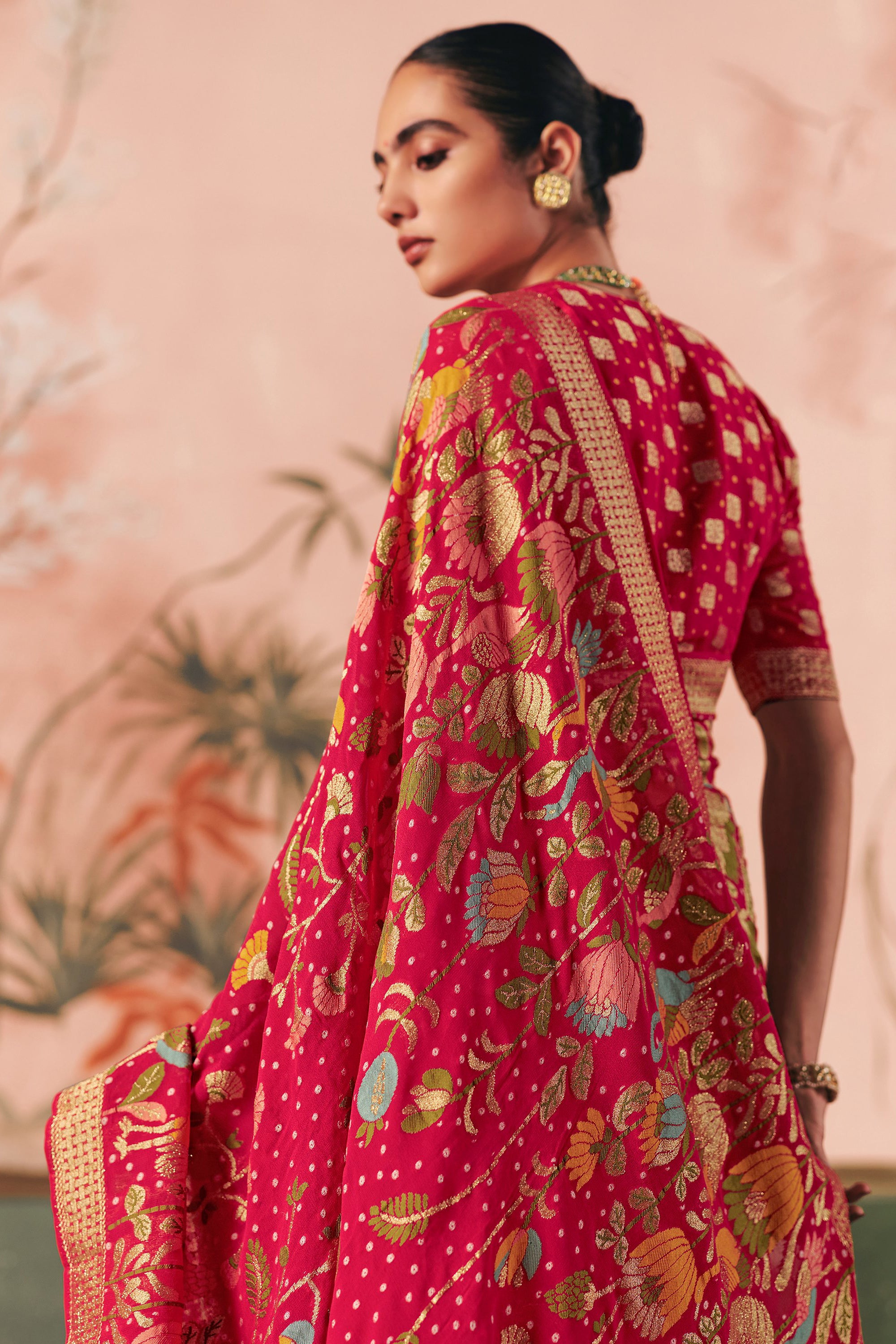 This vibrant pink banarasi saree features a rich, all-over floral and leaf weaving pattern highlighted with shimmering golden zari. The drape showcases intricate motifs in shades of teal, mustard, and orange, adding depth and elegance to the traditional design. The pallu is elaborately woven with dense floral artwork and a classic golden border, creating a luxurious festive look.