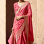 The georgette saree features a graceful pink shade with a soft, flowing drape highlighted by intricate golden zari weaving along the borders and pallu. The fabric falls elegantly with a subtle sheen, creating a refined and feminine look perfect for festive and traditional occasions.