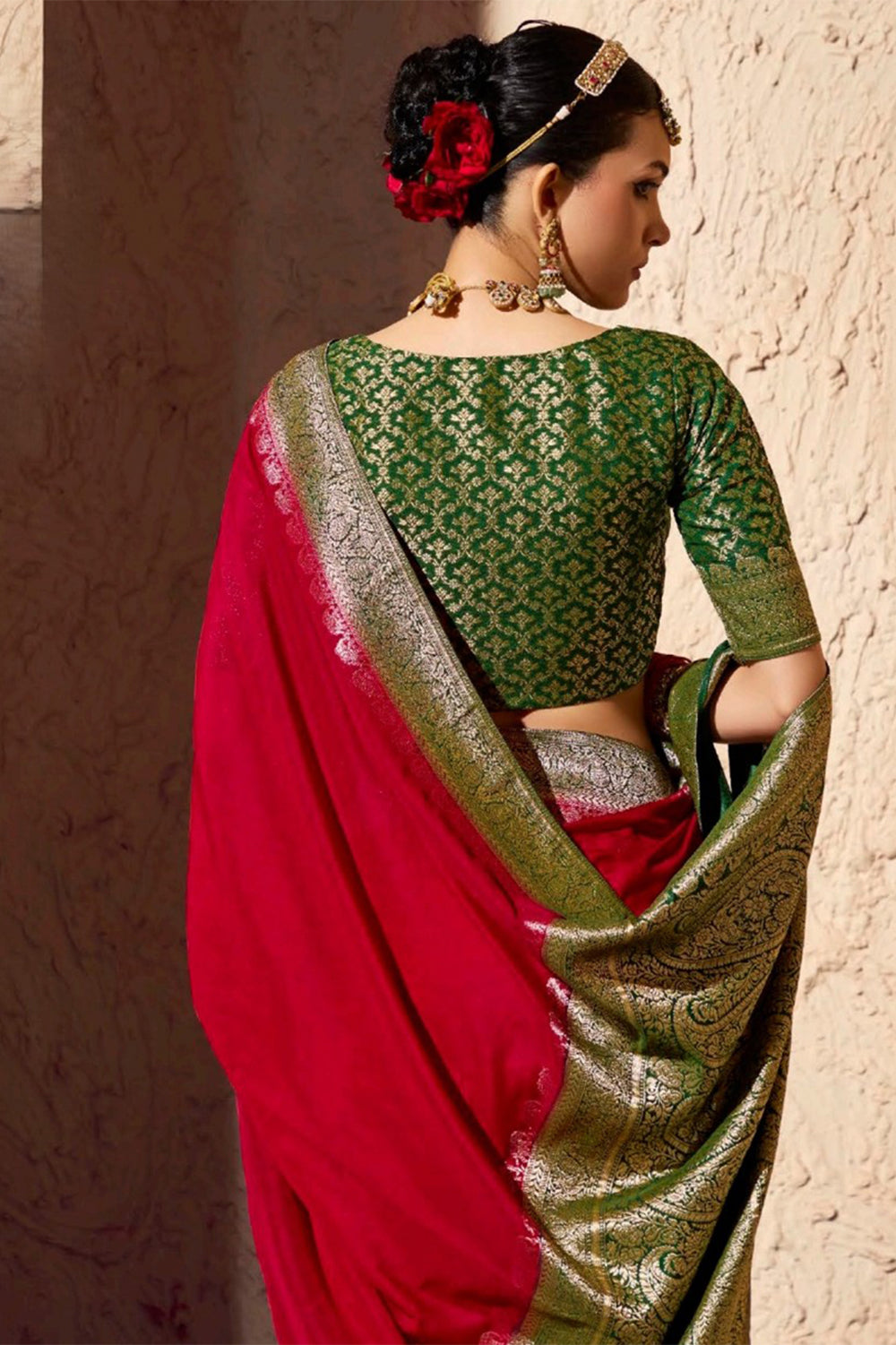 The matching green blouse features exquisite golden zari weaving all over, giving it a luxurious, heritage-inspired appeal. Its elegant half sleeves and classic neckline complement the saree perfectly, creating a bold contrast that elevates the entire ensemble.