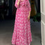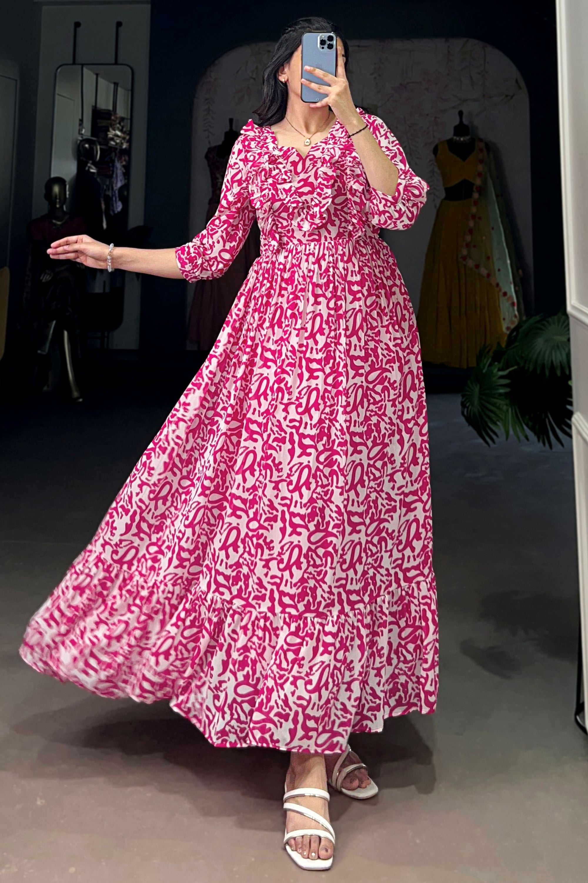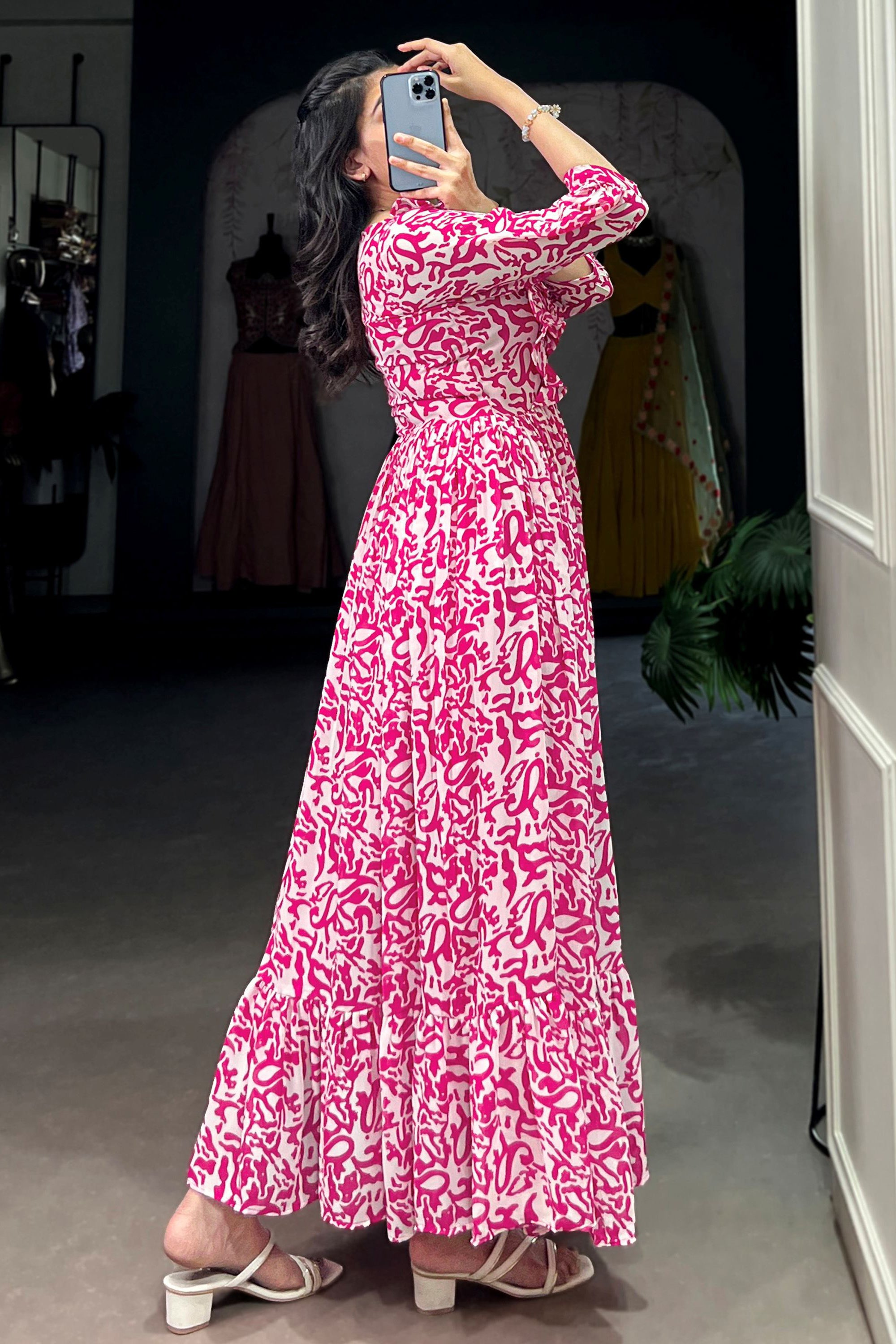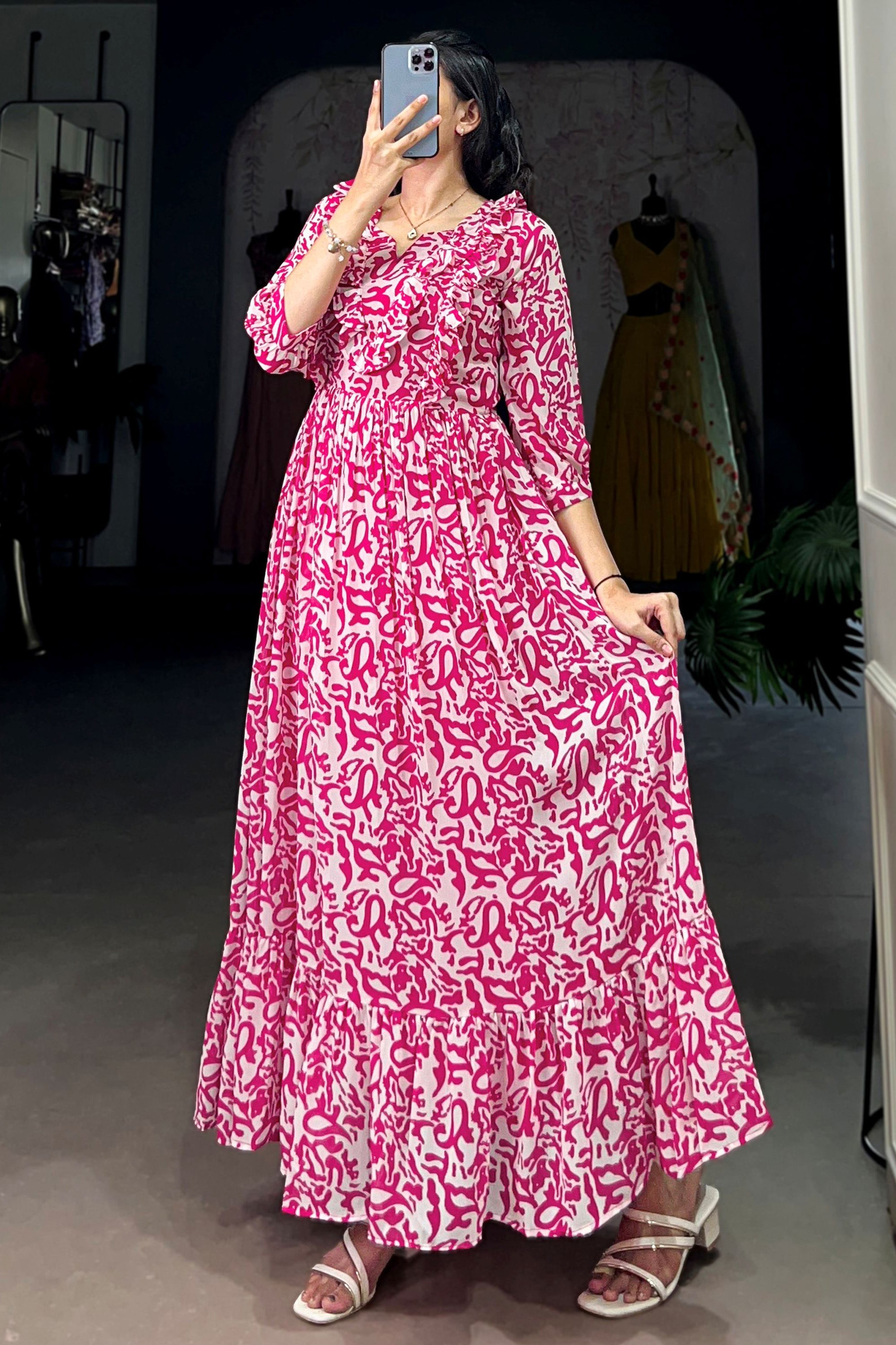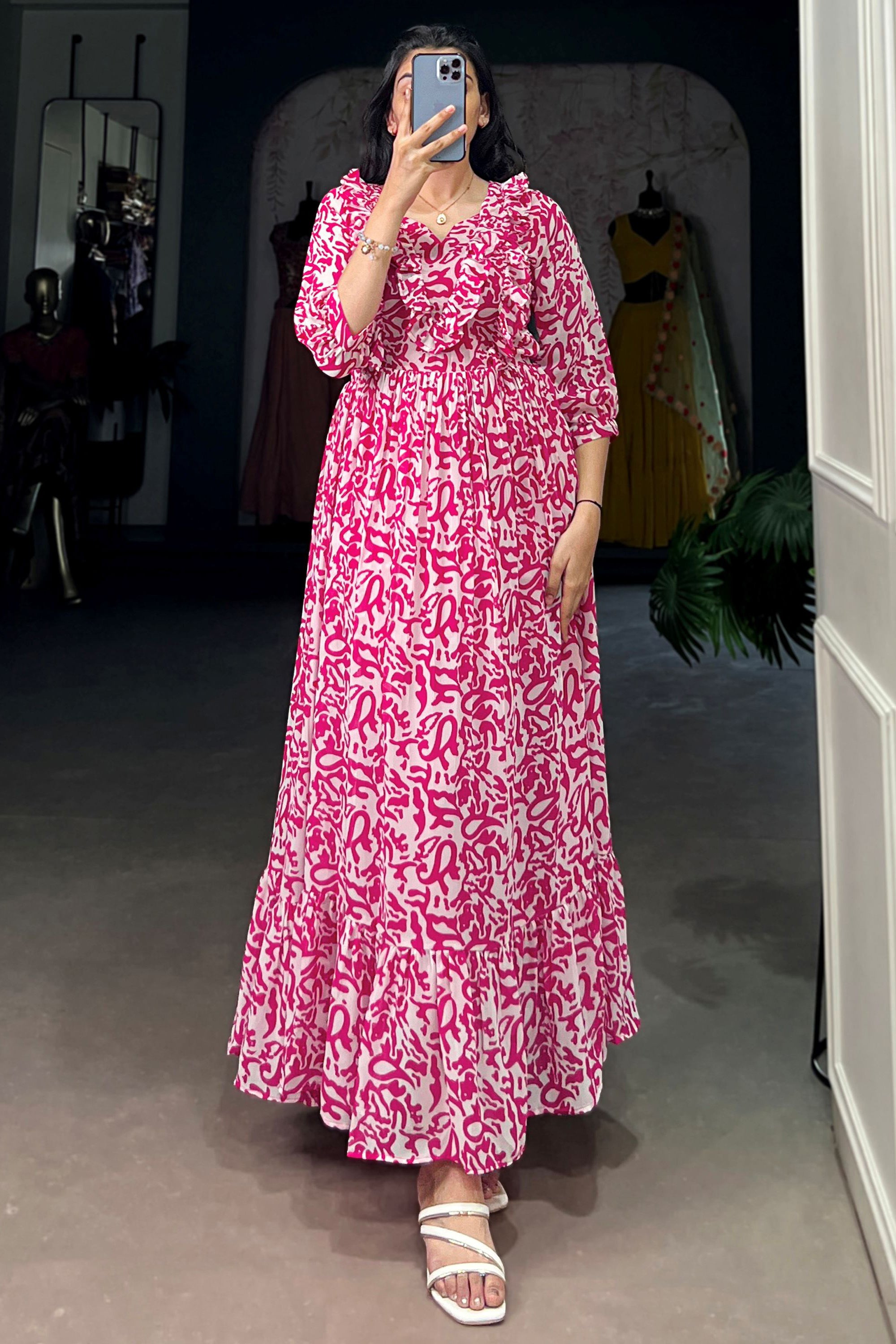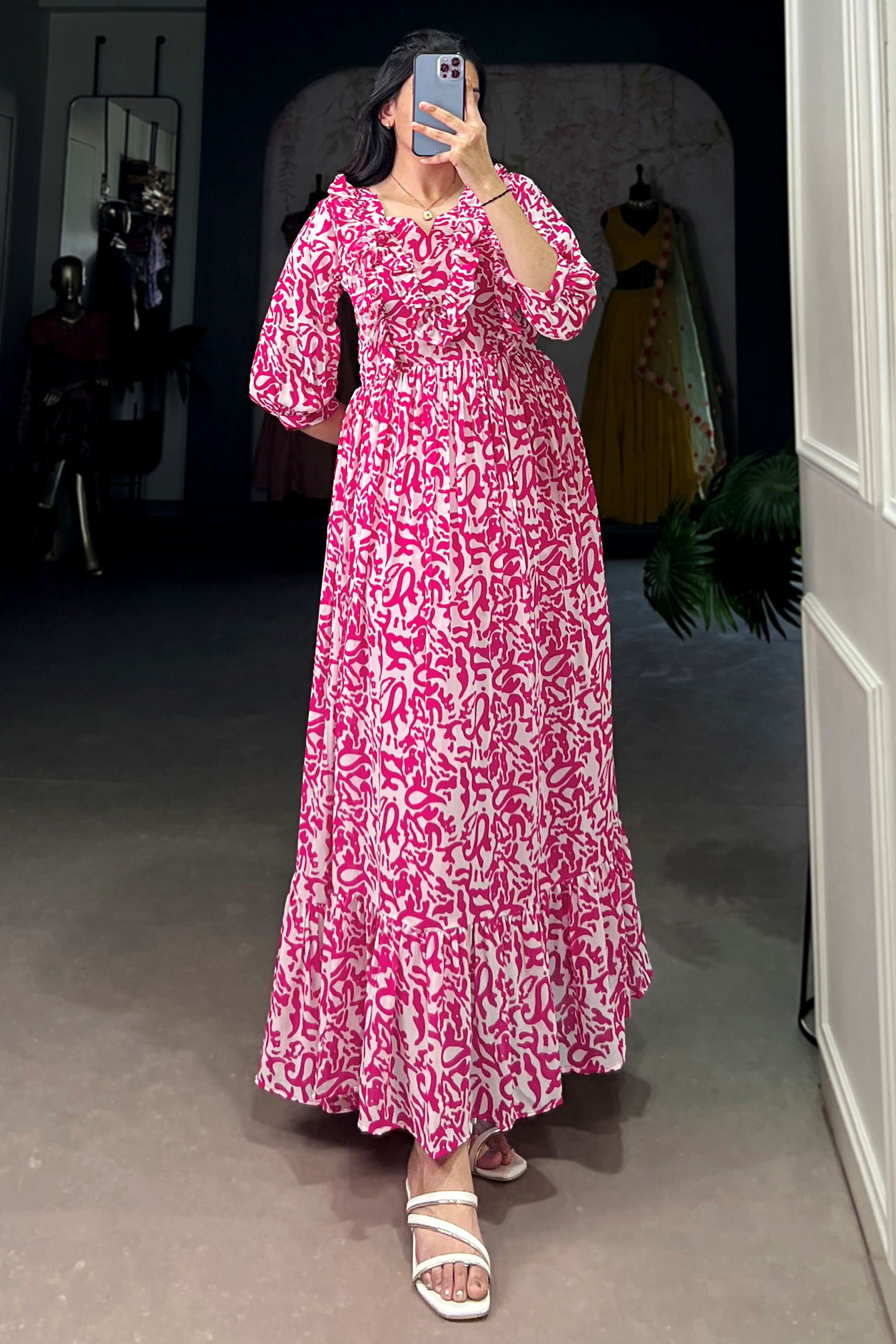 A flowy, ankle-length maxi dress featuring a vibrant pink abstract print on a soft white base, giving it a bold yet feminine look. The dress has a flattering gathered waistline that enhances the silhouette, along with delicate ruffle detailing around the neckline for added charm. Its three-quarter sleeves and tiered hem add movement and elegance, making it perfect for casual outings or brunch days.