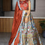 The lehenga is paired with a rich brown art silk blouse, showcasing elegant print work that perfectly complements the vibrant hues of the multi-color lehenga, creating a harmonious and stylish ensemble.