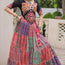The multi-color lehenga is designed in a patchwork style with tiered panels, featuring a mix of colors such as red, green, purple, and brown in traditional prints, creating a bohemian yet deeply cultural effect. The wide flare of the skirt makes it perfect for twirling during Garba or Dandiya nights, while the blouse’s fitted structure balances the voluminous silhouette.