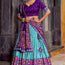 This lehenga choli set beautifully combines a deep royal purple blouse with a vibrant sky-blue lehenga, enhanced by traditional Ikat-inspired weaving patterns. The blouse features a scalloped neckline, short sleeves, and minimal woven motifs, paired with intricate border detailing. Its back design includes a stylish round cut-out with tie-up strings, adding an elegant touch.