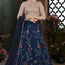 This ensemble features a stunning navy blue lehenga adorned with intricate multicolor floral embroidery. The lehenga’s surface is brought to life with vibrant red, yellow, and pink threadwork blooms interspersed with silver leaves and delicate mirror embellishments, creating an artistic garden-like feel.