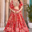 This stunning chinon red lehenga choli ensemble showcases a vibrant blend of traditional prints and rich embellishments. The blouse features a deep V-neck adorned with intricate golden thread embroidery and delicate pearl tassels on the neckline and hem, exuding elegance and royalty.