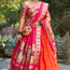 This vibrant jacquard silk lehenga choli set exudes traditional charm with its stunning color combination and intricate designs. The orange lehenga features a radiant orange hue adorned with subtle woven motifs and is beautifully finished with a broad magenta border that flaunts zari embroidery and brocade-style patterns.