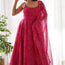 This pink chiffon gown features beautiful bandhani print work, blending traditional charm with a modern silhouette. The soft, flowing chiffon fabric enhances the gown's graceful appearance, making it an ideal choice for festivals and special occasions. Pair it with accessories for a stunning, vibrant look.