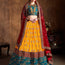 • Make the heads turn as soon as you dress up this gleaming teal green-yellow colored lehenga choli.