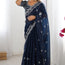 Turn heads at parties and party functions with this elegant blue organza silk saree, adorned with delicate thread and sequins embroidery. Its lightweight drape and festive shimmer make it a standout choice for special occasions.