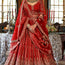 Adding a touch of sophistication, the attire is styled with a double dupatta. One dupatta is a lightweight net, draped gracefully over the head, while the second is a rich Banarasi weaving dupatta in matching red with intricate golden patterns.