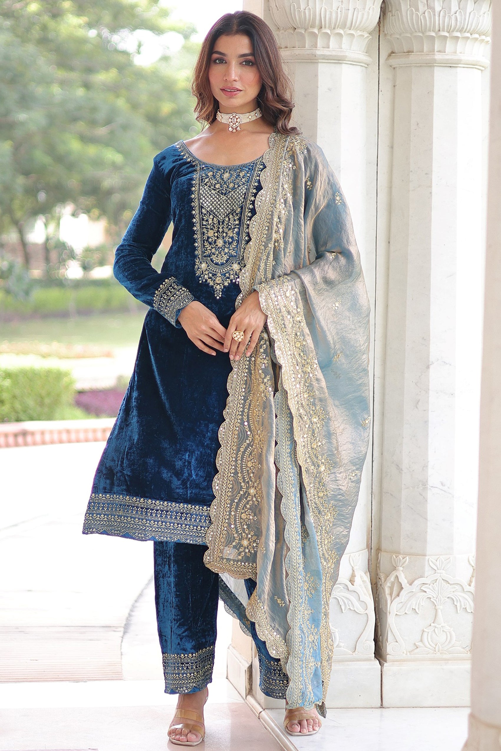 Amazing Blue Sequins Embroidered Velvet Salwar Kameez With Dupatta