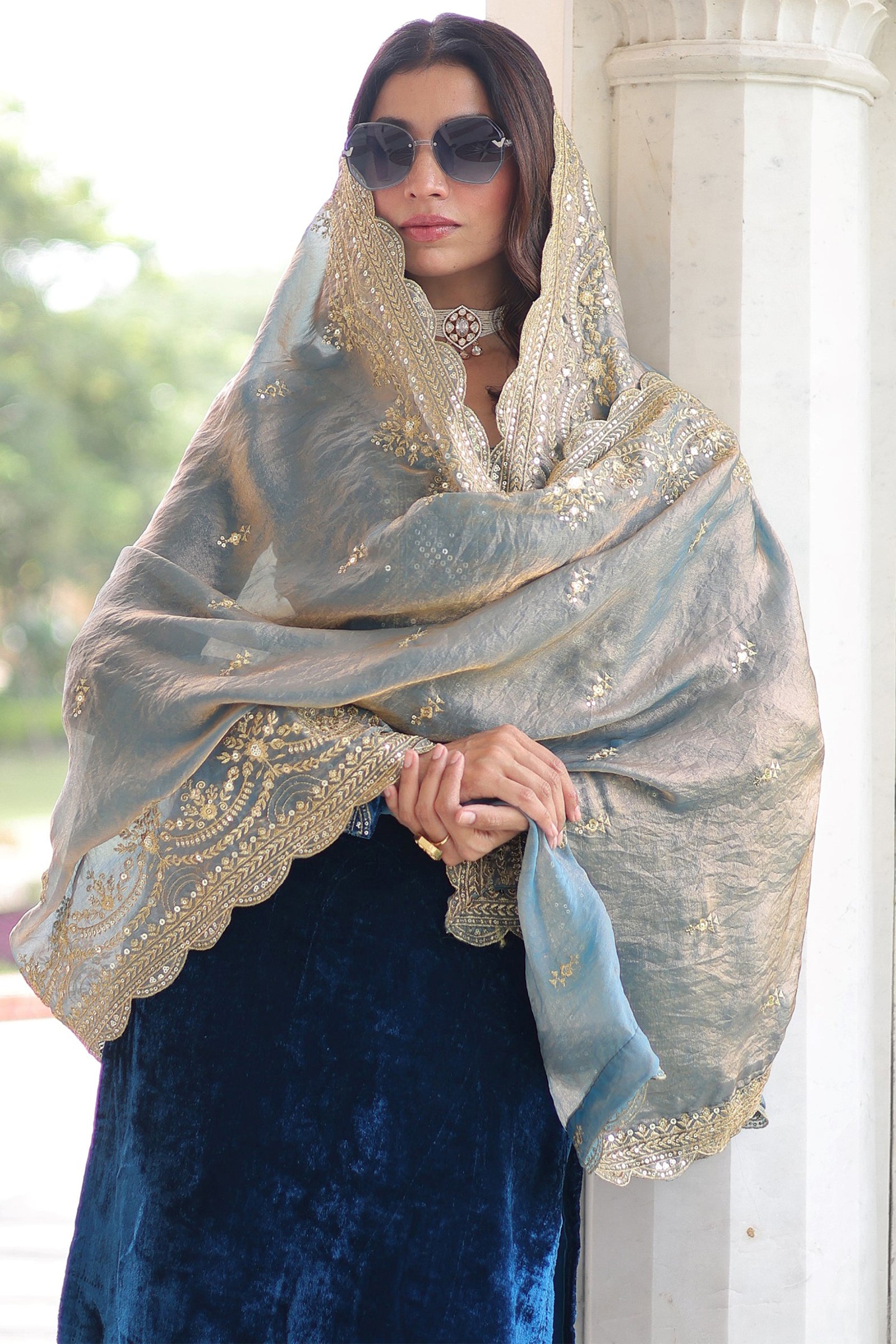 The dupatta is crafted in a light gold-tinted silk organza fabric, beautifully contrasting with the deep blue suit. The border features heavy gold embroidery with scalloped detailing and mirror accents, exuding richness and festive glamour.