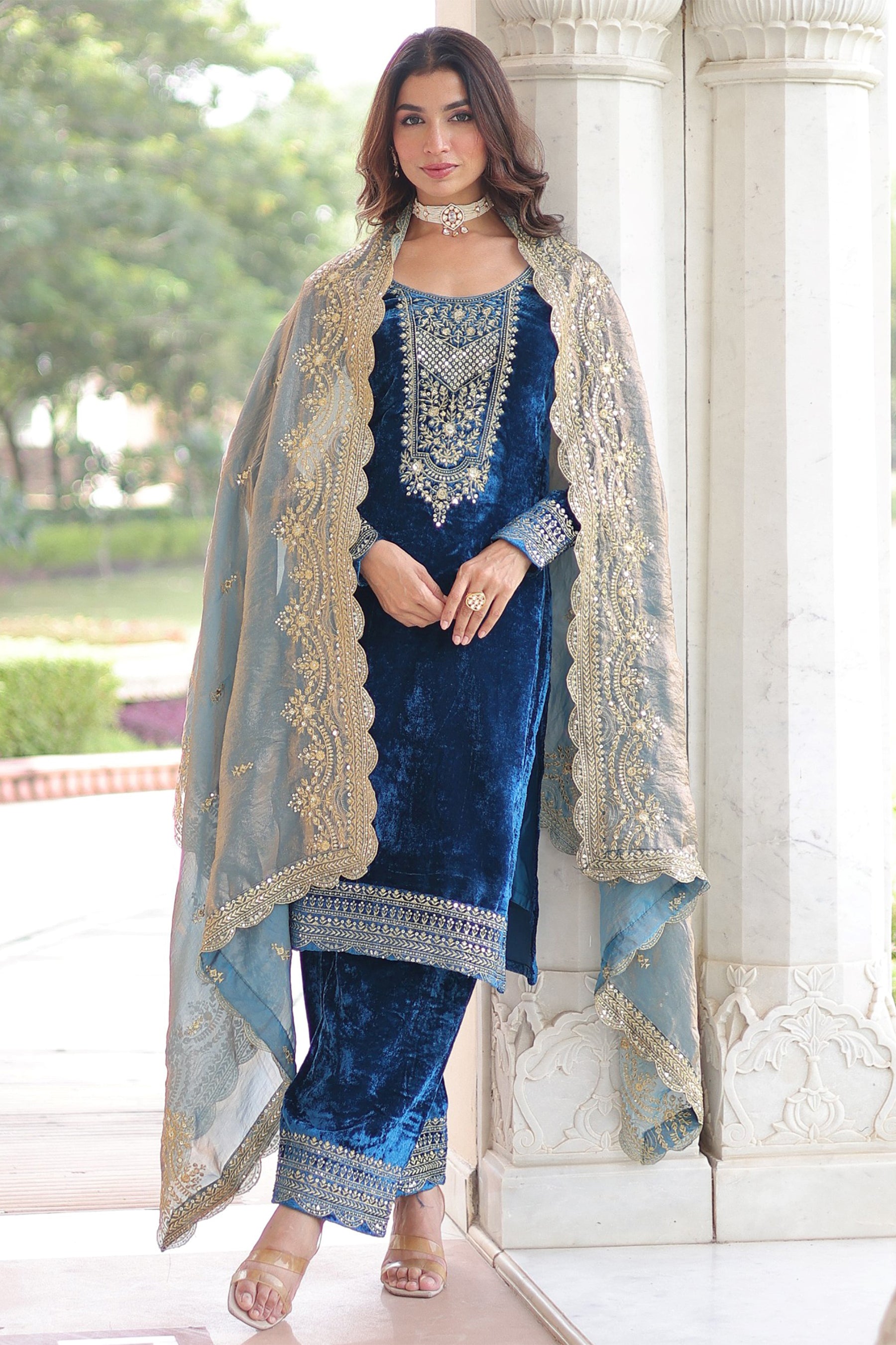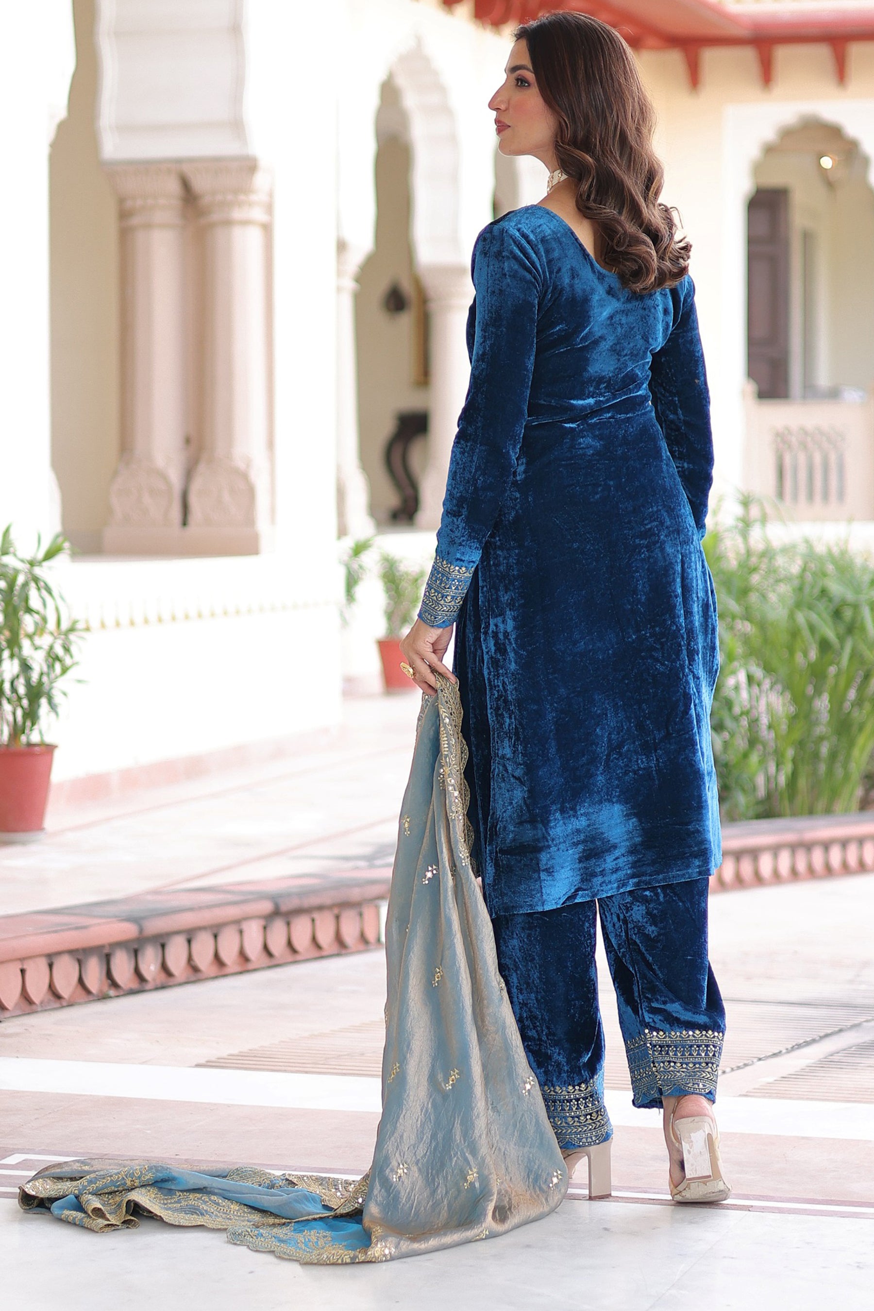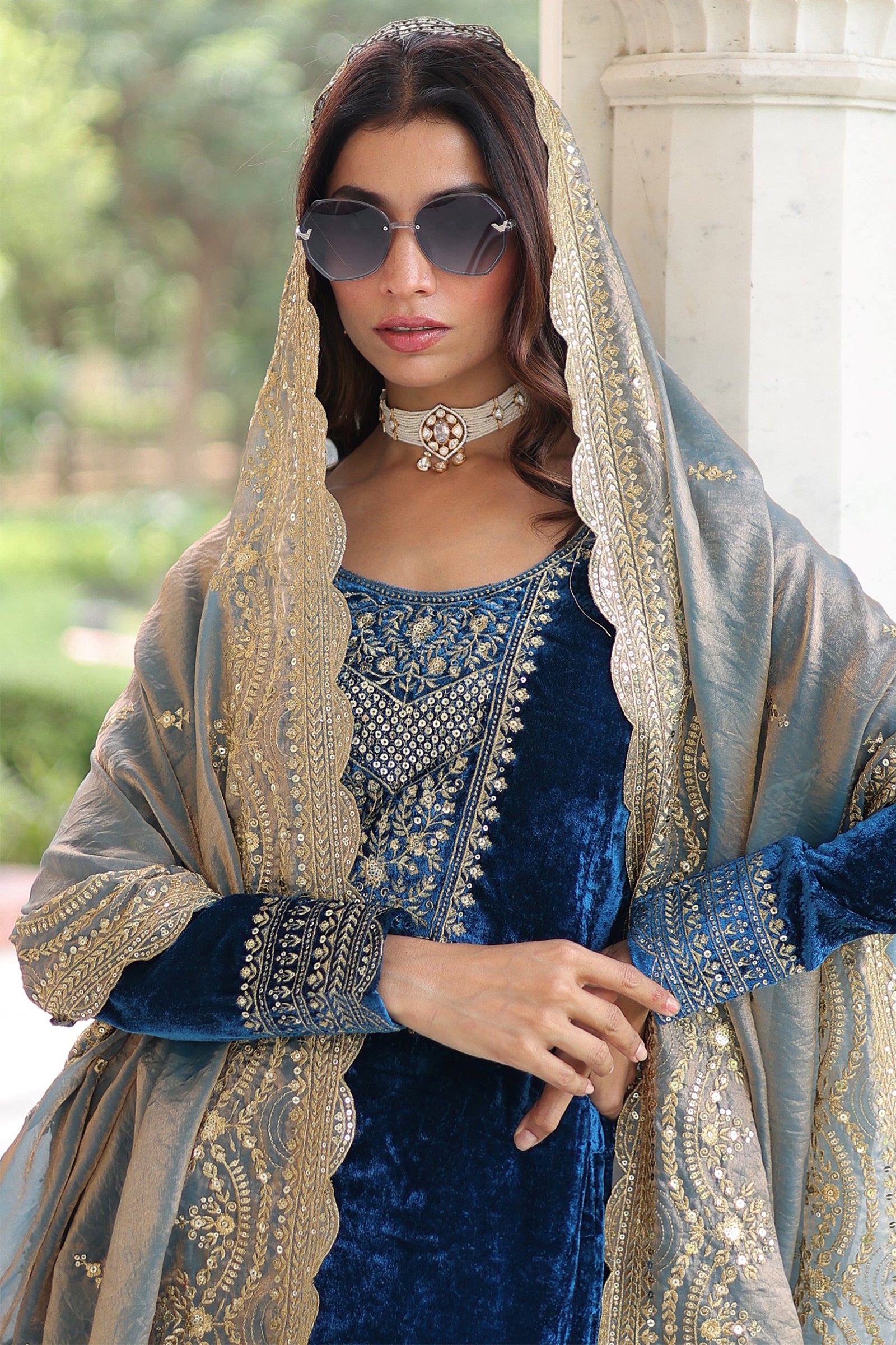 The suit is crafted in a rich blue velvet fabric, delivering a regal and sophisticated appeal. The neckline and front panel are adorned with intricate zari embroidery and sparkling mirror work, enhancing the outfit with a majestic touch. Full sleeves with matching embroidered cuffs add a graceful finish, making it perfect for weddings, festive functions, and evening occasions.