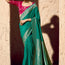 The saree features a captivating emerald, green base highlighted with rich gold zari weaving along the border and pallu, creating a regal and traditional aesthetic. Its fluid drape and intricate motifs add a luxurious sheen, making it ideal for festive celebrations, weddings, and grand traditional events.
